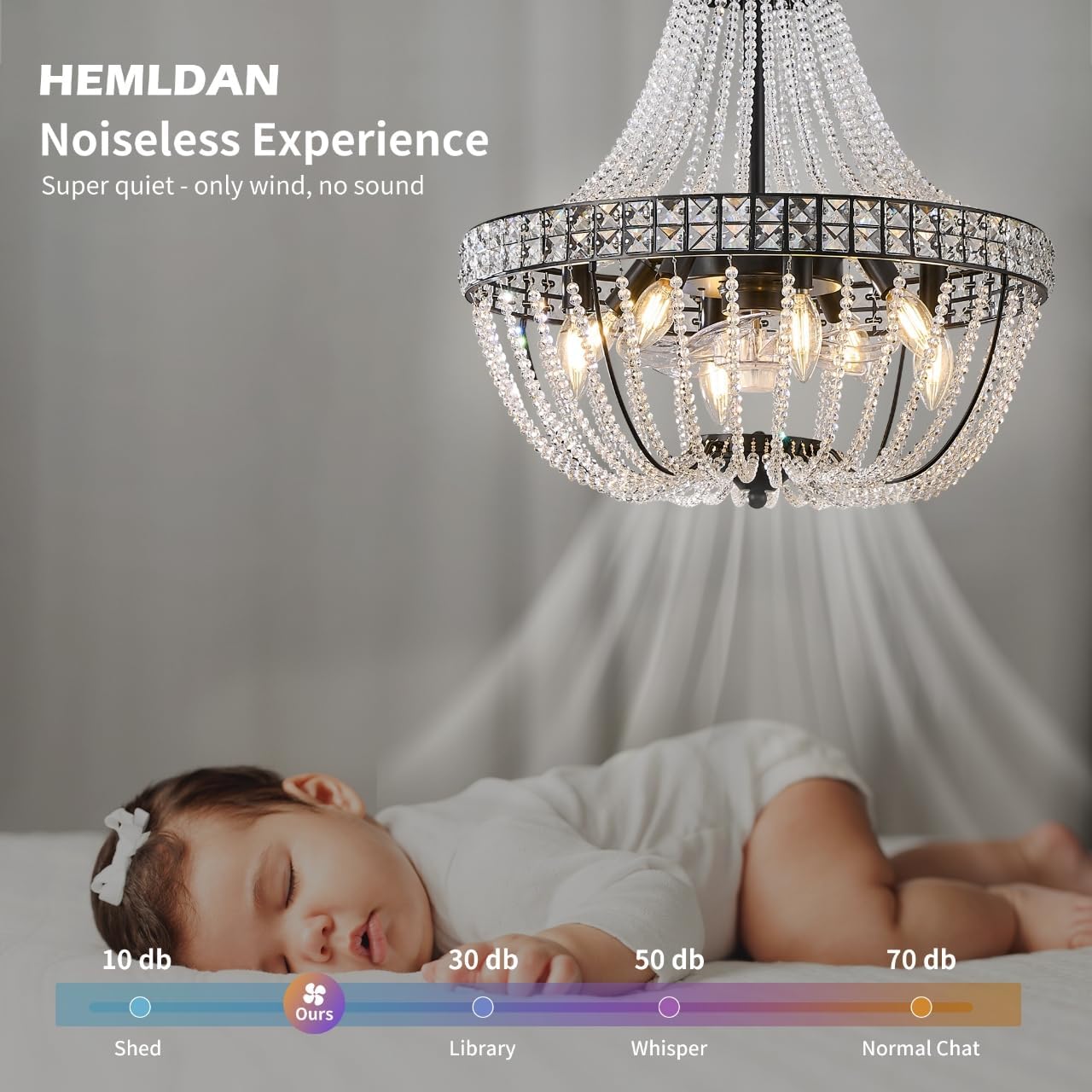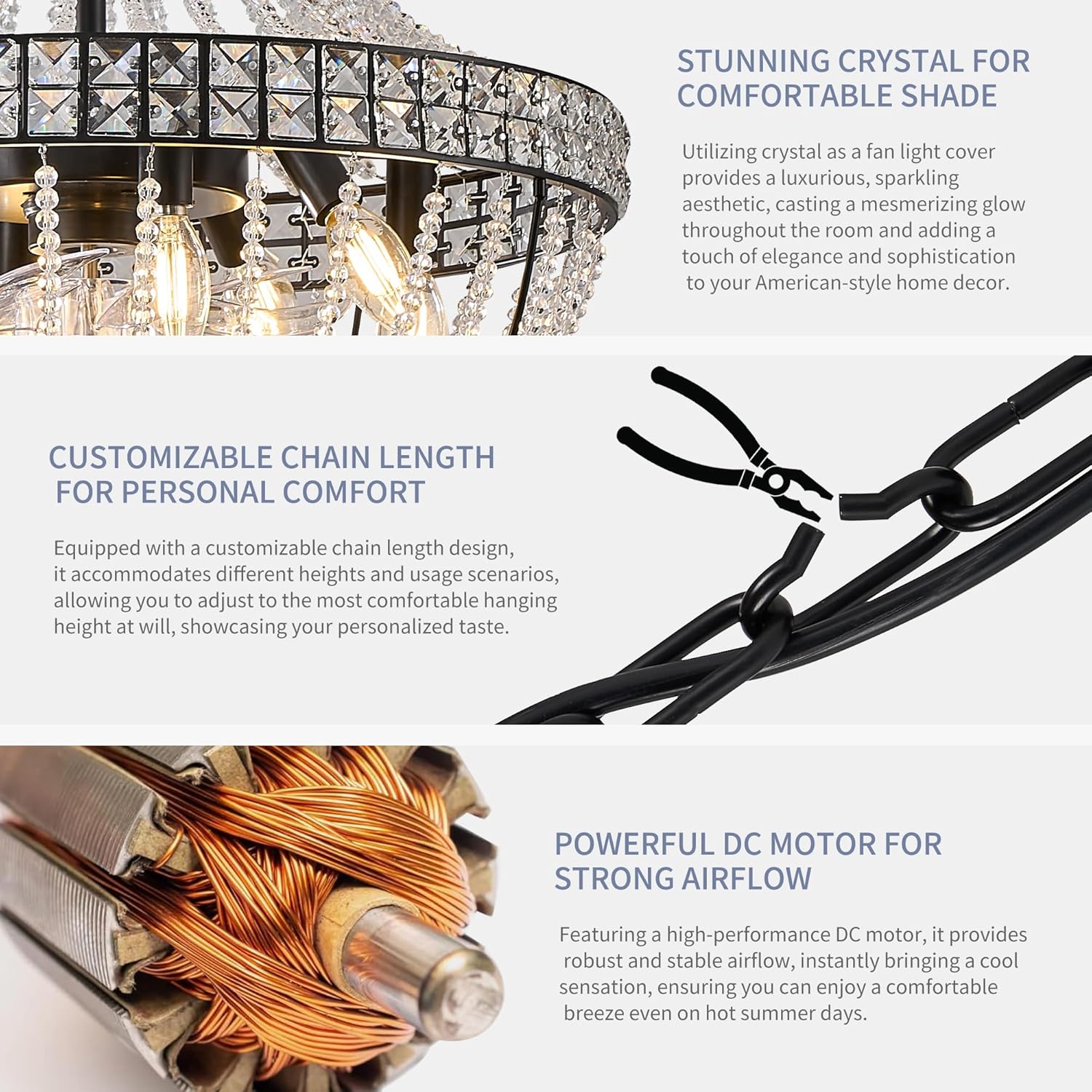 | Specific Uses For Product | Compact Living Spaces: 20'' diameter fits apartments, condos, or lofts., Dining Room Drama: Pair with dimmable E12 bulbs (sold separately) for intimate dinners., Grand Entryway: Wow guests with a statement piece that doubles as air circulation., Master Suite Glam: Whisper-quiet operation (≤35dB) for undisturbed sleep in luxury., Year-Round Use: Reverse blades in winter to redistribute warm air without drafts. |