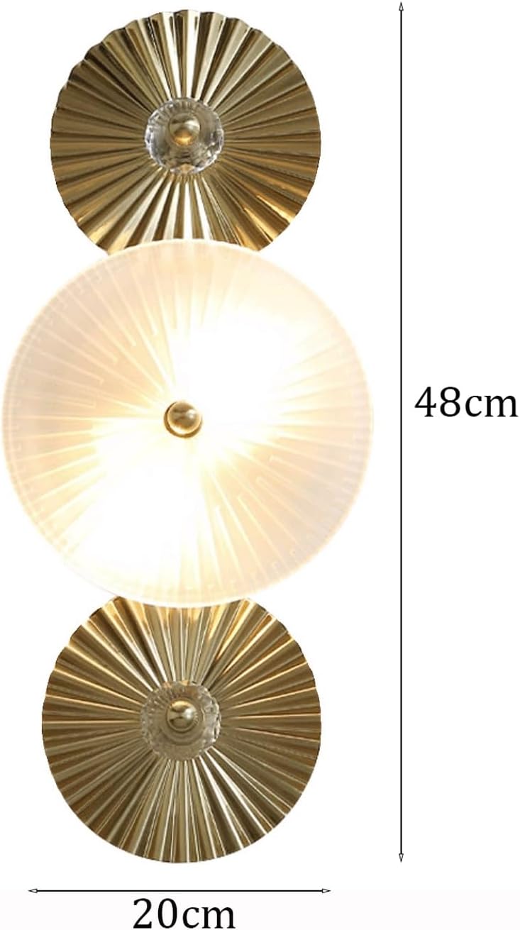 Product Parameters:Type: Wall Sconce / Wall LampStyle: Modern Contemporary, Light Luxury, Art Deco, Glam, Decorative, Ambient Lighting, AbstractMaterial: Metal (brass-tone corrugated finish), Glass (white pleated textured )Color: Brass Tone (metal), Frosted White (glass)Dimensions:Overall Height: 18.9" (48cm)Diameter: 7.9" (20cm)Socket Type: E14Bulb Included: NoOptimized Special Feature: This modern style 1-light wall sconce is a distinctive and decorative piece, featuring a vertical arrangement of three circular elements. The and bottom elements are brass-tone corrugated metal discs, while the central element is a white pleated textured glass that serves as the main light source. Designed for a single E14 bulb (not included), the fixture casts a soft, diffused fixed light through the glass, creating an inviting ambient glow and an abstract artistic statement. This light source is ideal for living rooms, dining rooms, hallways, or entryways, enhancing a modern, light luxury, or Art Deco inspired décor.Applicable Space: Ideal for Living Room Accent Wall, Dining Room, Hallway, Entryway, Foyer, Bedroom, Office, Hotel Lobby, or other spaces desiring modern decorative lighting.