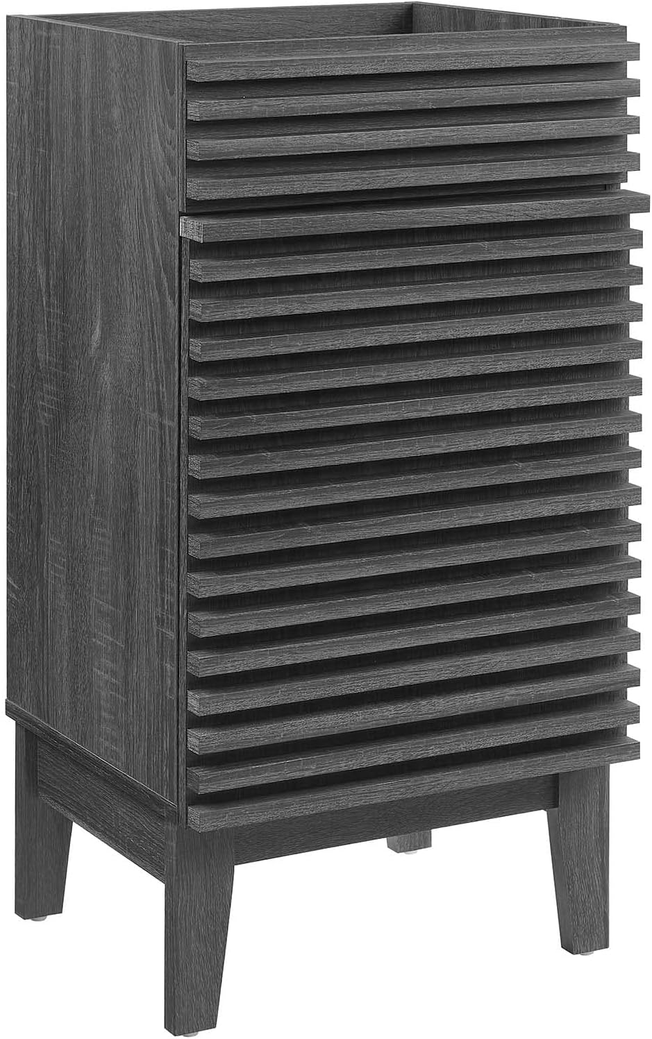 Tap into mid-century aesthetics with the Render 18" Vanity Cabinet. The Render Bathroom Vanity features a durable particleboard frame with a smooth laminate, four tapered wood legs, and an adjustable storage shelf behind a soft-close hinged door. Sleek lines and crisp design align for an edgy style designed to meet your needs. Boasting a mid-century modern style, this vanity features a solid construction with a pleasing look and practical functionality. Assembly required. Sink basin and fixtures not included.