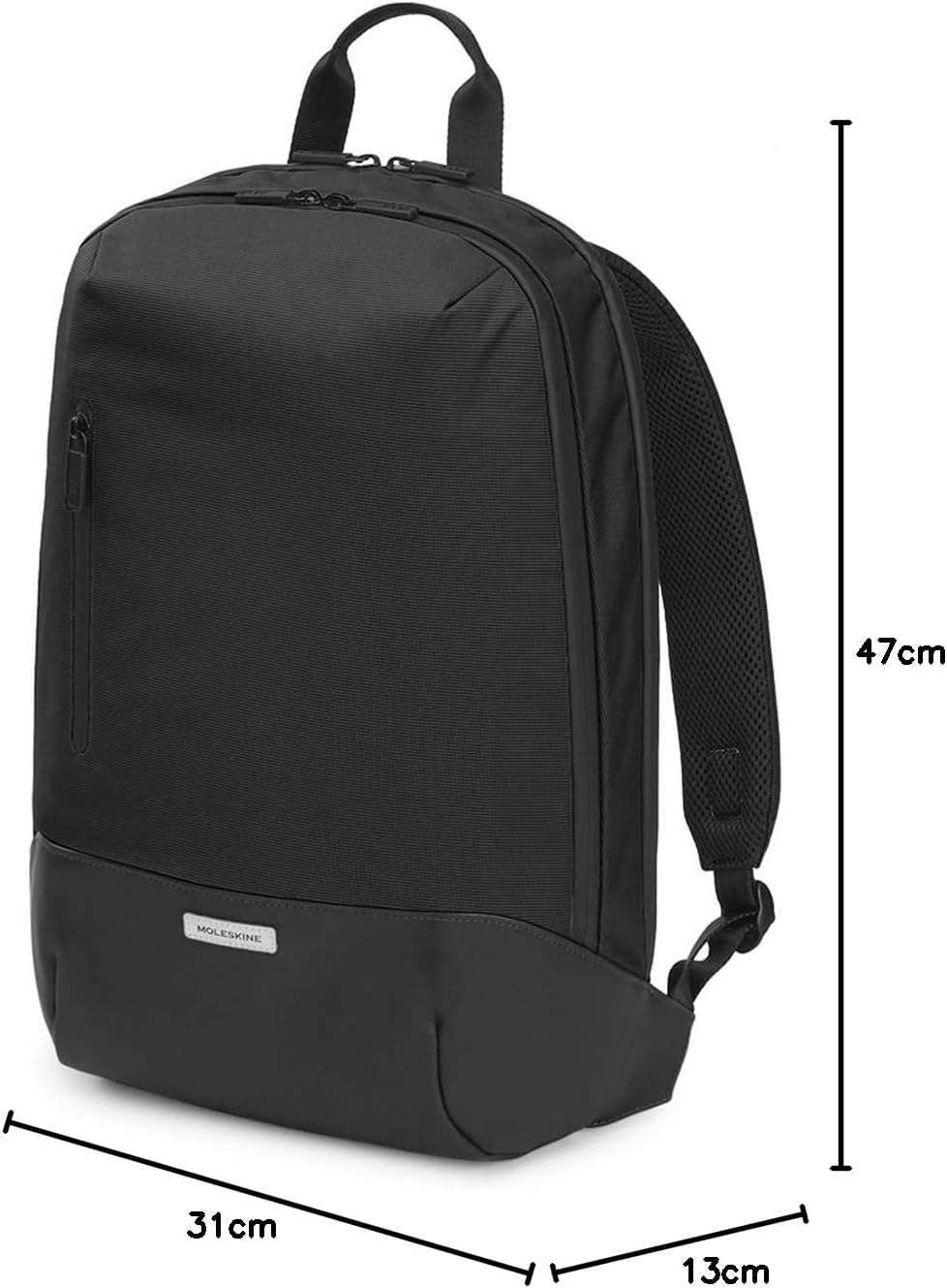 The Metro Backpack is a contemporary urban bag that has been researched and cleanly designed allowing you to travel around town with everything you need to connect with your current location, previously or where you are going to come. Your gear will stay inside with a clean top reverse zip while the fresh lines on the protective base cut out urban noise and keep on moving. The calming yet dynamic Metro Backpack features a unique embossed honeycomb lining and subtle reflective details that give a touch of light to any journey. Exterior Features: -Two zippers to separate your laptop and your belongings - Padded adjustable shoulder straps for classic style - Breathable air mesh back for cool comfort while traveling - Heat sealed front pocket for easy access - Moleskine logo zip - Luggage strap for long distance travel - Waterproof top reverse zip Interior Features: - My Moleskine Note Pocket to Keep Your Ideas - Organizer with 2 pen holders and 1 business card holder - Interior zip pocket Materials: - Polyamide Size: - Size: 31x47x13 cm