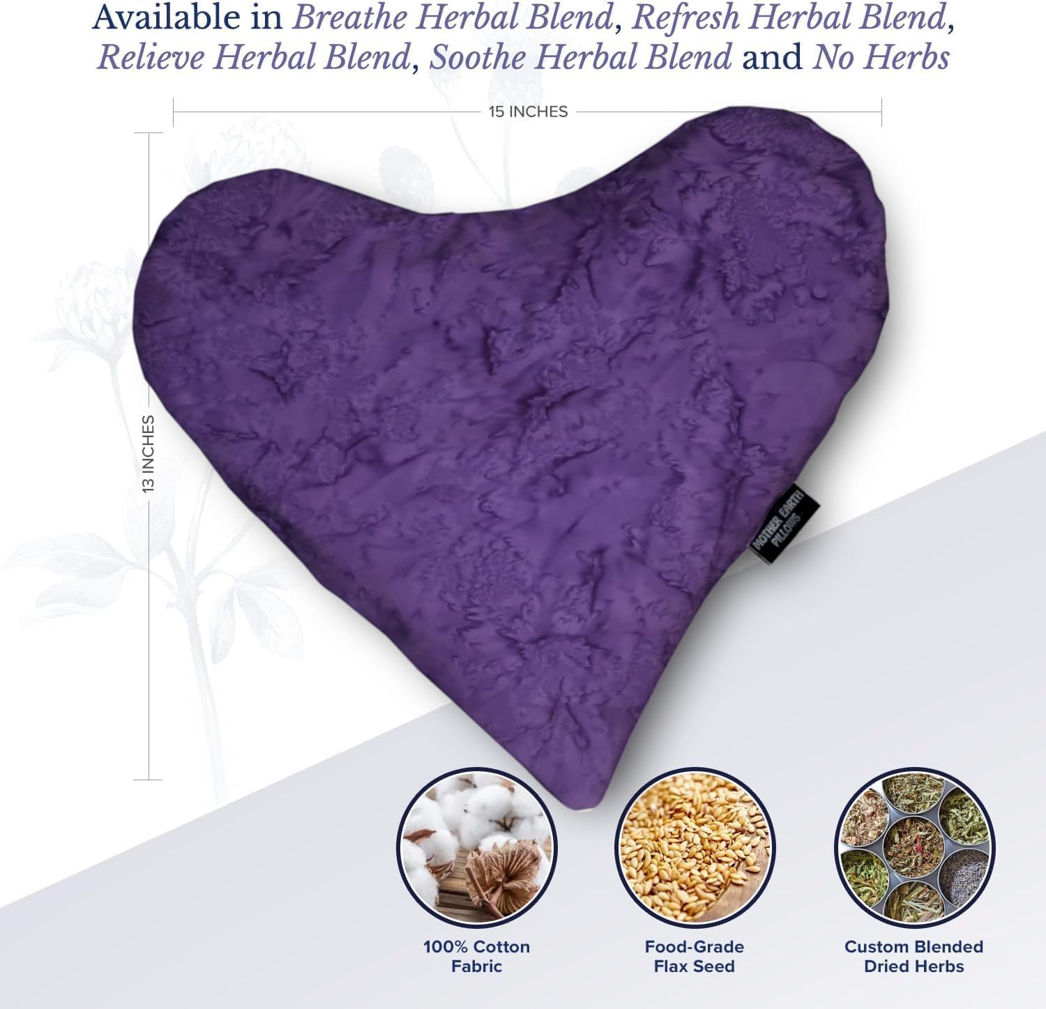 The Large Heart Flax Pillow encompasses most of the shoulder and is ideal for helping with rotator cuff, repetitive motion, and other shoulder injuries. When laid on the chest it provides a gentle pressure and heat that can ease congestion. Its large size makes it ideal to bring relief from menstrual cramps. The Large Heart stays warm for approximately 45 minutes. This Large Heart Flax Pillow is filled with food-grade flax seeds and an herbal blend of lavender, lemon balm, peppermint that uplifts and invigorates. To clean, remove cover, wash in cold water and lay flat to dry. Do not expose the inner pillow to moisture. For warm therapy, place pillow on a clean plate and fold so it can rotate freely. Heat in microwave for two minutes. Re-warm at 30 second intervals. Do not overheat. Use caution when removing from microwave. Not for use in a conventional or toaster oven. For cold therapy, place in a sealed plastic bag and store 2+ hours in the freezer. Always test hot/cold temperature of pillow before applying to skin.