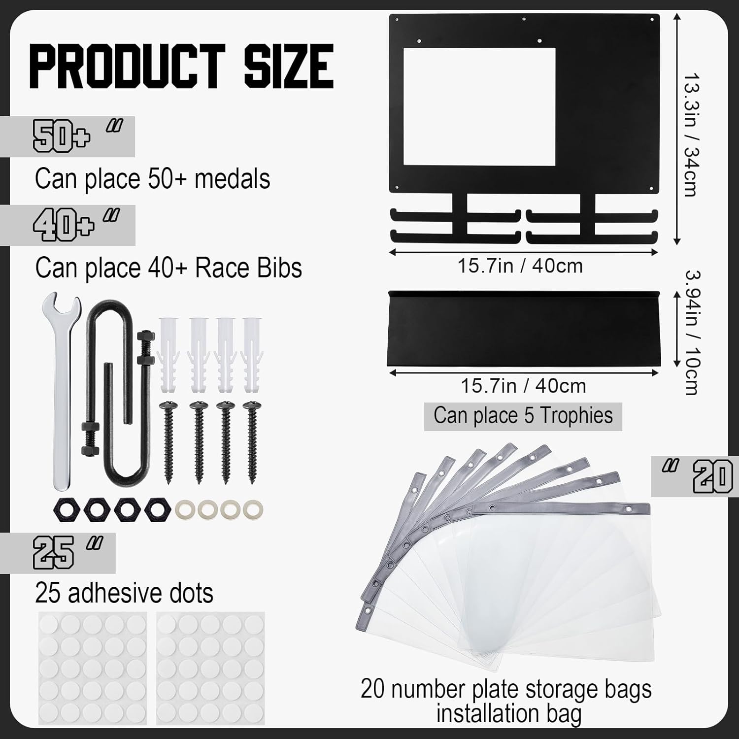 Features: The wall mounted design optimizes space and keeps your medals, bibs, and trophies neatly displayed and easily accessible, allowing for a clutter free environment Protect and beautifully showcase race bibs and medals from marathons, 5Ks, or cycling events to commemorate personal accomplishments with pride. Ideal present for runners, marathon participants, triathletes, and cyclists seeking to display their athletic milestones Specifications: Material: metal Color: black Size: 15.75 x 13.39 inches/ 40 x 34 cm Package includes: 1 x Medal display board 20 x Bib pockets 25 x Adhesive dots Notes: Manual measurement, please allow slight errors on size. The color may exist a slight difference due to different screen displays