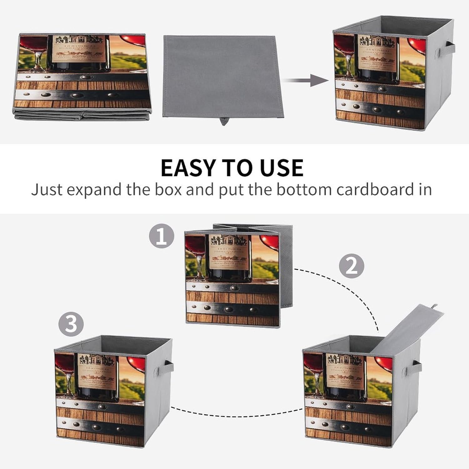 Wooden Wine Barrel on Wine Bottle printed Fabric Storage Bin Provides An Effective Solution For Storage And Organization. Can Maintain The Orderliness Of Household Items. Large Storage Bags Are Perfect For Storing Clothes, Baby Products, Towels, Toys, Pet Supplies, And More. Foldable Cubes Storage Bag Is Made With A Unique Style, Exquisite Details, And Craftsmanship. Clothes Organizer Container Is Perfect As A Holiday Gift For Friends And Family