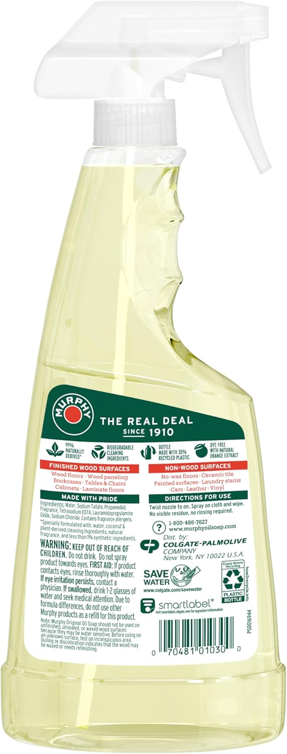 Murphy Oil Soap Cleaning Spray is a trusted choice for safely cleaning wood and a variety of surfaces in your home. Specially formulated to remove dirt and grease, this cleaner restores both finished wood and non-wood surfaces to their natural beauty with ease. Use on finished wood (wood floor, wood paneling, bookcases, tables, chairs, cabinets, laminate floors) and non-wood surfaces (no-wax floors, ceramic tile, painted surfaces, laundry stains, vinyl). Made with 99% natural ingredients (1), is dye free, and has 0% phosphates. The convenient spray bottle and refreshing orange scent make cleaning a breeze, while its no-rinse formula leaves no visible residue, just a beautiful shine. Whether you’re caring for wood floors, cabinets, tables, or tackling other household surfaces like ceramic tile and no-wax floors, Murphy Oil Soap Spray is the versatile cleaner you can rely on to maintain your home’s warmth and charm. (1) Specially formulated with: water, plant-derived cleaning ingredients, natural fragrance, and 1% synthetic ingredients