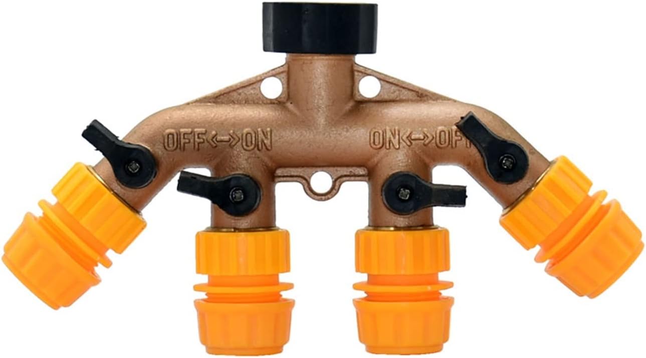 DownspoutsBrass 4/7mm 1/2 Hose 4 Way Splitter With Thread Garden Tap Shunt Four Irrigation Valve Quick Connector 1PcsBrass four-way garden faucet with 3/4" threadConnecting hose: inner diameter 4mm 12mm hose.Nipple connector, about 16mmThe product uses 3/4 European standard line, yellow + black detachablePacking quantity: 1PCSCompatible with international standard connectors, European standard BSPSuitable for your quick connectors, flowers, plants, lawns, agriculture, villas, easy to install,Independent valve can be closed, sturdy and durable, long service life,Welcomed by users.Note that the product dimension drawing is manually measured, and there may be an error of 1-2mm.