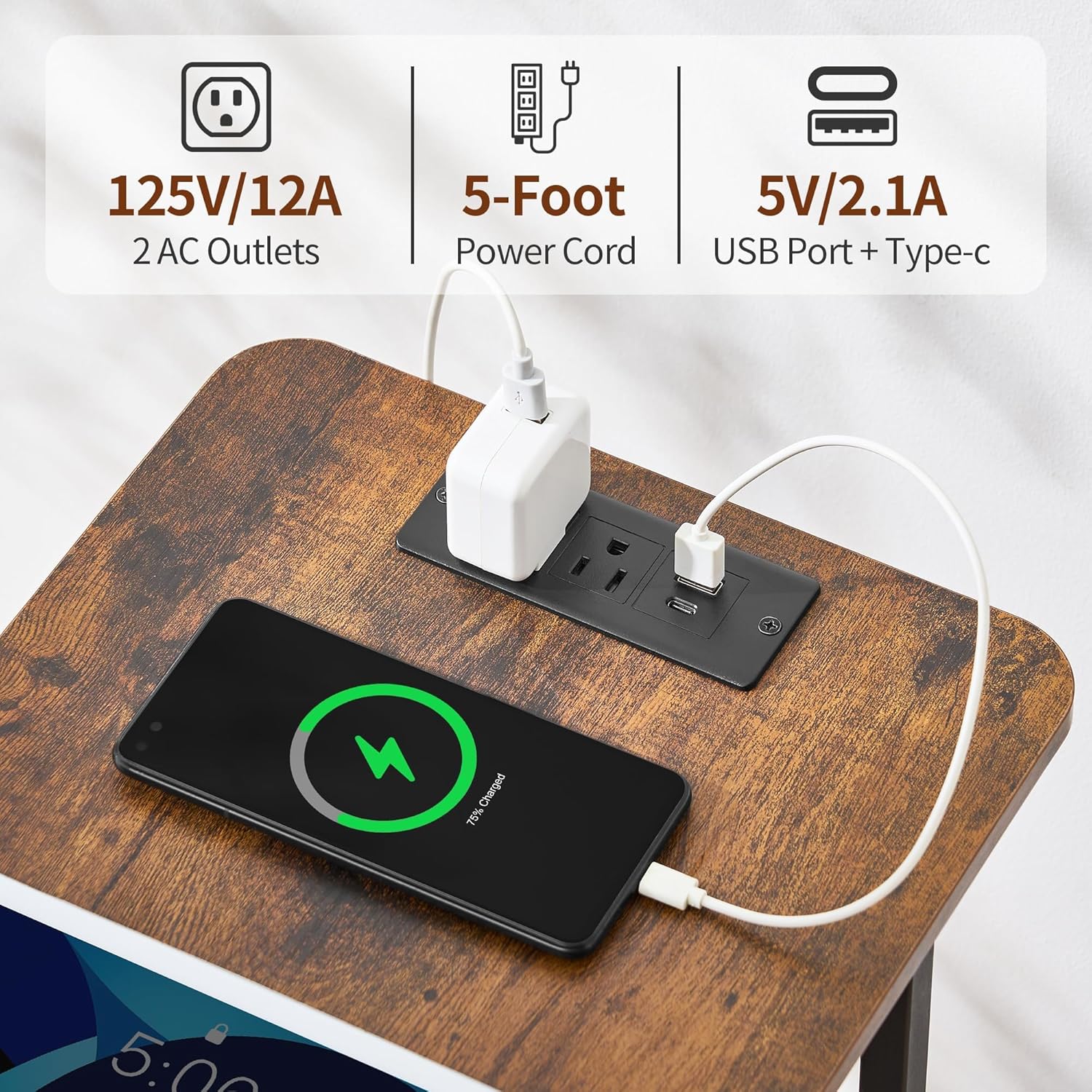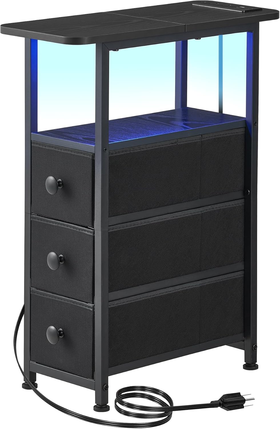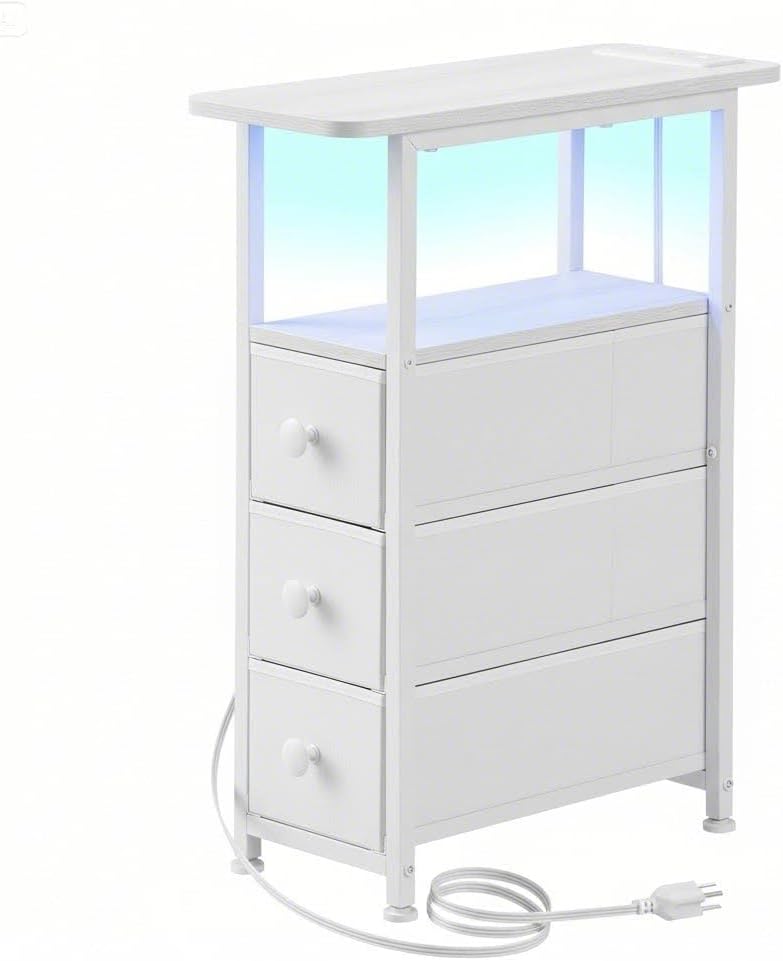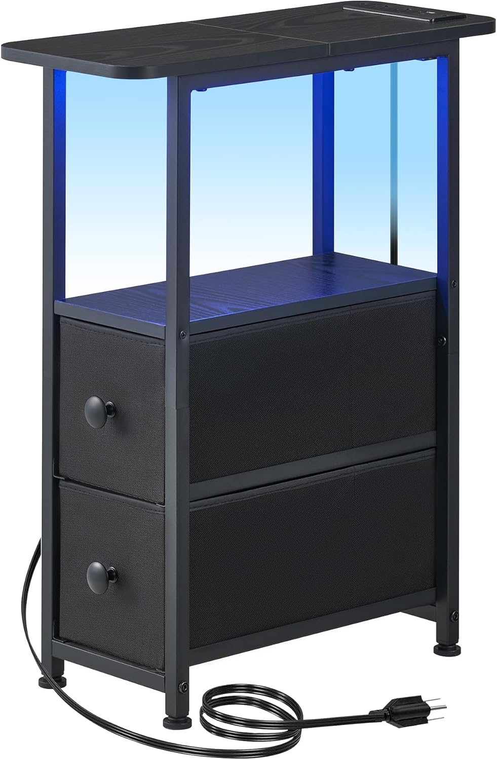 Narrow End Table with LED & with Charging Station - Space-Smart Nightstand for Small Spaces. Conquer clutter with this Narrow End Table! This narrow side table packs a 4-in-1 charging hub (2 AC outlets + 1 USB + 1 Type-C) and ambient LED lighting, perfect as a narrow nightstand or compact couch-side organizer.