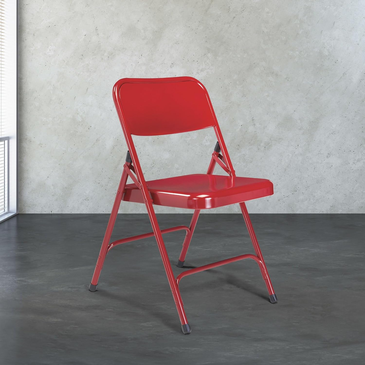 The National Public Seating Folding Chair features an electromagnetically welded steel back and steel seat. Its 18-gauge 7/8in. round tubular frame features double hinges for added stability and durability, two U-shaped double riveted cross braces and a powder-coated finish. Chair also features color coordinated polypropylene glides and V-tip plugs for added stability. Sold in a pack of 52 chairs.