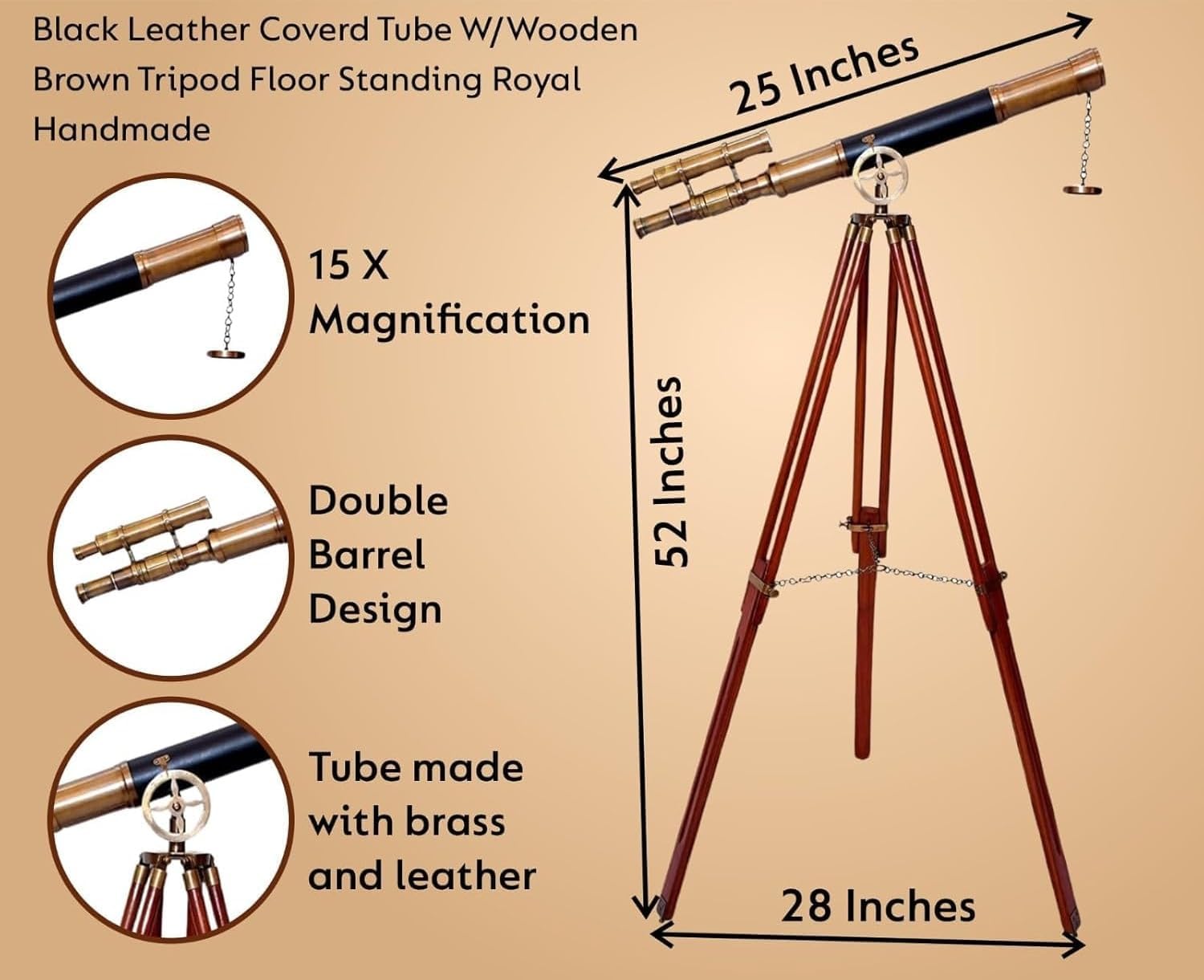 Bring the spirit of exploration into your space with this handcrafted Antique Brass Double Barrel Telescope by nauticalshoppee. Designed to capture the elegance of classic naval instruments, this telescope features a black leather-covered brass tube, double barrel design, and a rich antique finish, mounted on a solid brown wooden tripod. Standing 52 inches tall with a 25–28 inch tube length and 25-inch ground diameter, this telescope is both a functional optical tool and a sophisticated decorative piece. It offers 42X magnification, perfect for light observational use or simply to evoke a sense of maritime adventure. Crafted from premium solid brass and hardwood, this telescope is individually tested to ensure quality and durability. Ideal for home decor, executive offices, balconies, or libraries, it’s also a standout gift for collectors, navy enthusiasts, or anyone with an eye for vintage style. Securely packed in corrugated export packaging, it’s ready for immediate display or gifting.