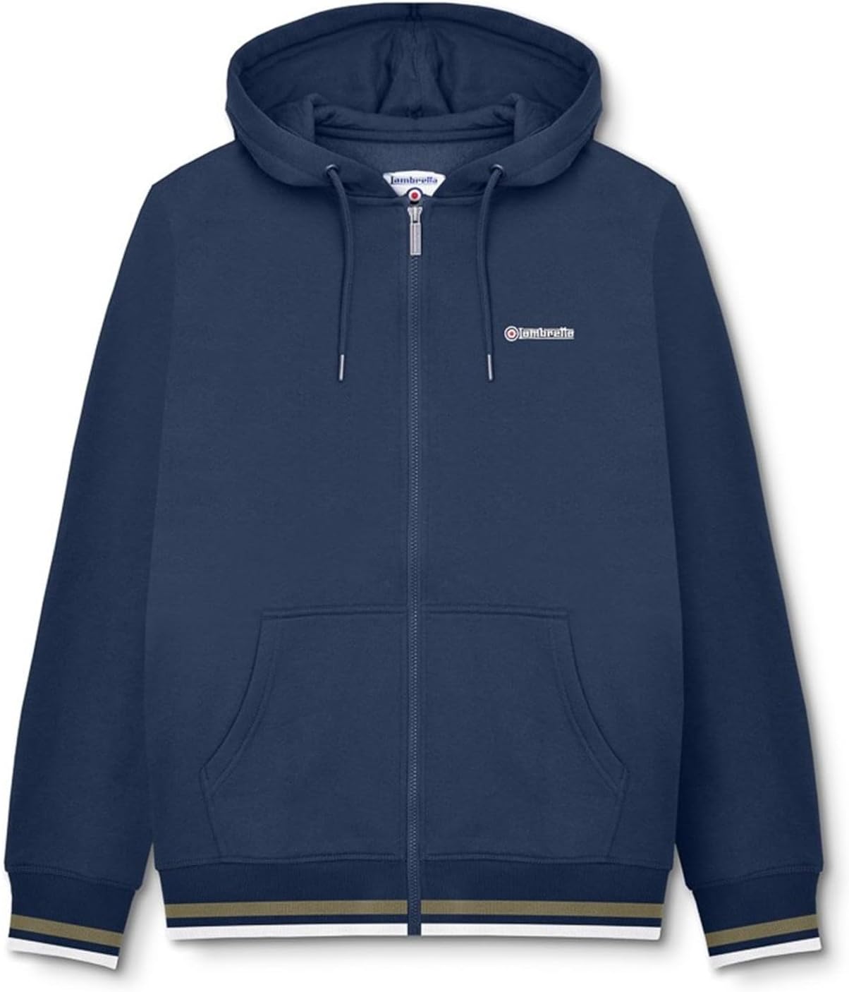 Lambretta's zip-up hoodie features a soft brushback fleece, with our model, who's 6'2", wearing a size M. It boasts embroidered Lambretta branding, a blend of 70% cotton and 30% polyester. The hood is lined and has a drawcord, while the zip is full-length. It includes a split pouch pocket, ribbed cuffs and hem, and a straight hemline, maintaining the fleece's soft touch.