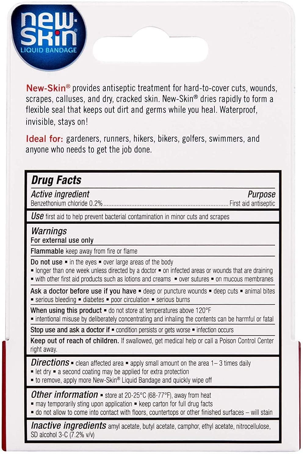 New-Skin Liquid Bandagee 1.0 FL OZ bottle of liquid bandage with brush applicator. Don't let your skin slow you down! New-Skin Liquid Bandage is no ordinary bandage. It's flexible enough to suit your needs - be it a huge scrape now or a small blister you need to prevent on your daily running rub. Rapid-drying and waterproof, our bandages keep up with your active life and keep you moving. New-Skin provides antiseptic treatment for hard-to-cover cuts, wounds, scrapes, calluses, and dry, cracked skin. New-Skin Liquid Bandage dries rapidly to form a tough protective cover that's waterproof and keeps out dirt and germs while letting skin breathe. Used to protect cuts and scrapes, prevent and protect blisters, cover painful hangnails and chapped or cracked finger tips, and prevent the formulation of calluses. Particularly useful for runners, athletes, dancers, hikers, bikers, bowlers, golfers, tennis players, fishermen, and musicians.