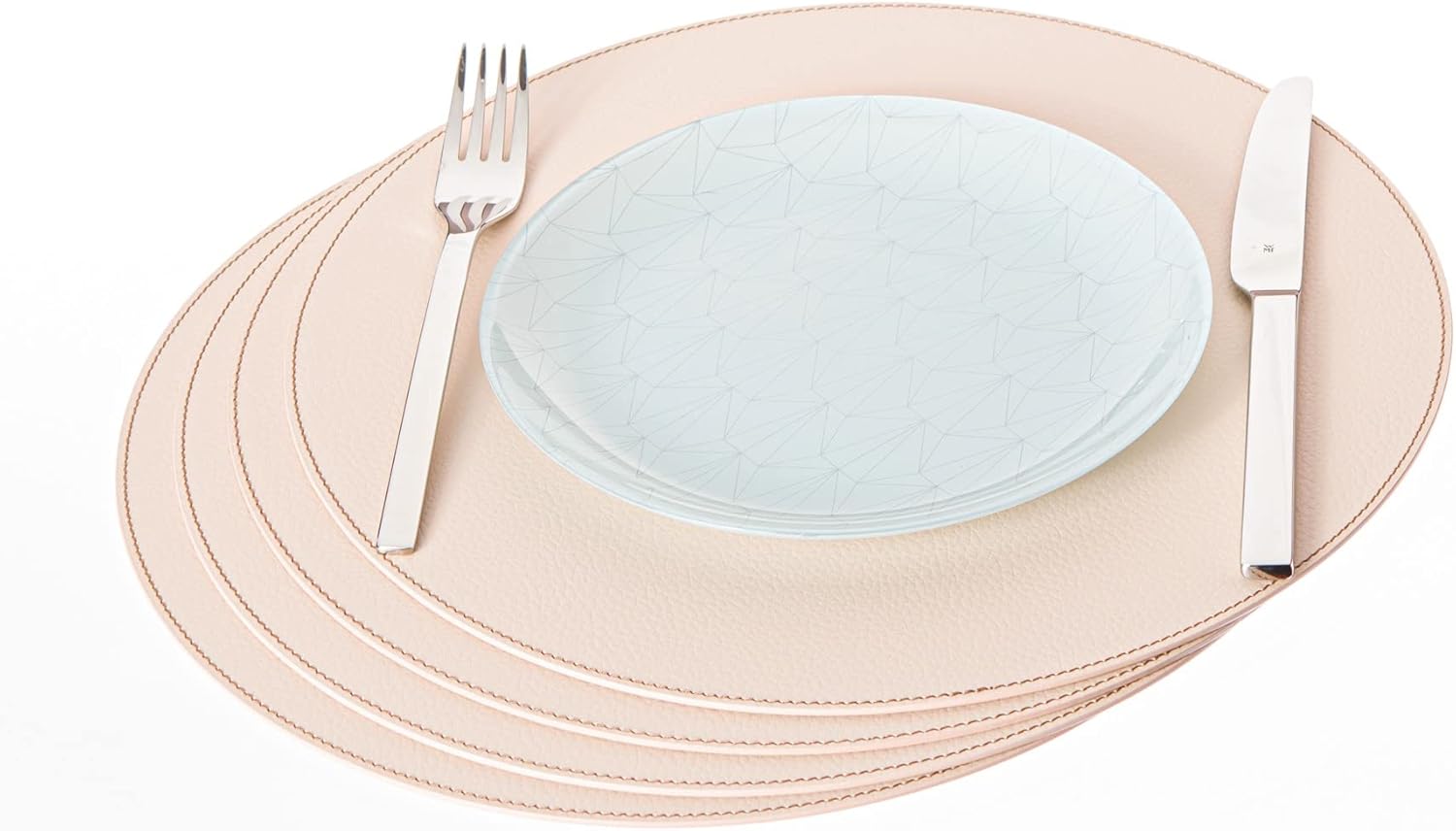 Set of 4 placemats made of recycled lether, one side embossed. Size 15''. Heat resistant and very well water proofed. Beige border stitching, finished colored edges.