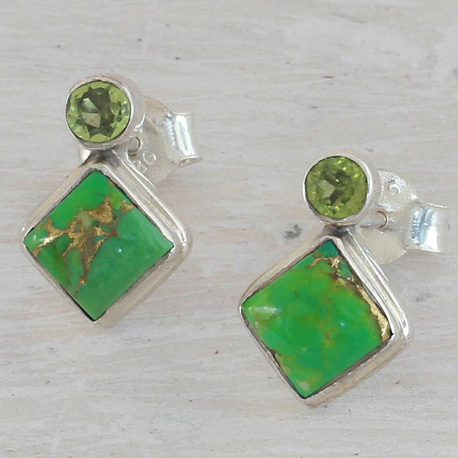Novica works together with talented artists, artisans, and designers around the world to produce stunning, keepsake handmade treasures. Our mantra is to Spread Happiness, so rest assured - we’ll do everything we possibly can to ensure you’re a happy customer!About this item: Round faceted peridot shines above luminous composite turquoise in these handcrafted earrings from Neeru Goel in India. Stones are cut and fitted into high-polish sterling silver bezels for a clean and classic look.About our Artist: Neeru Goel inherited her passion for jewelry from her grandmother. 'My grandmother would look into each and every detail, from how jewelry is made to the materials. It feels great to see my designs being admired by other people.'...