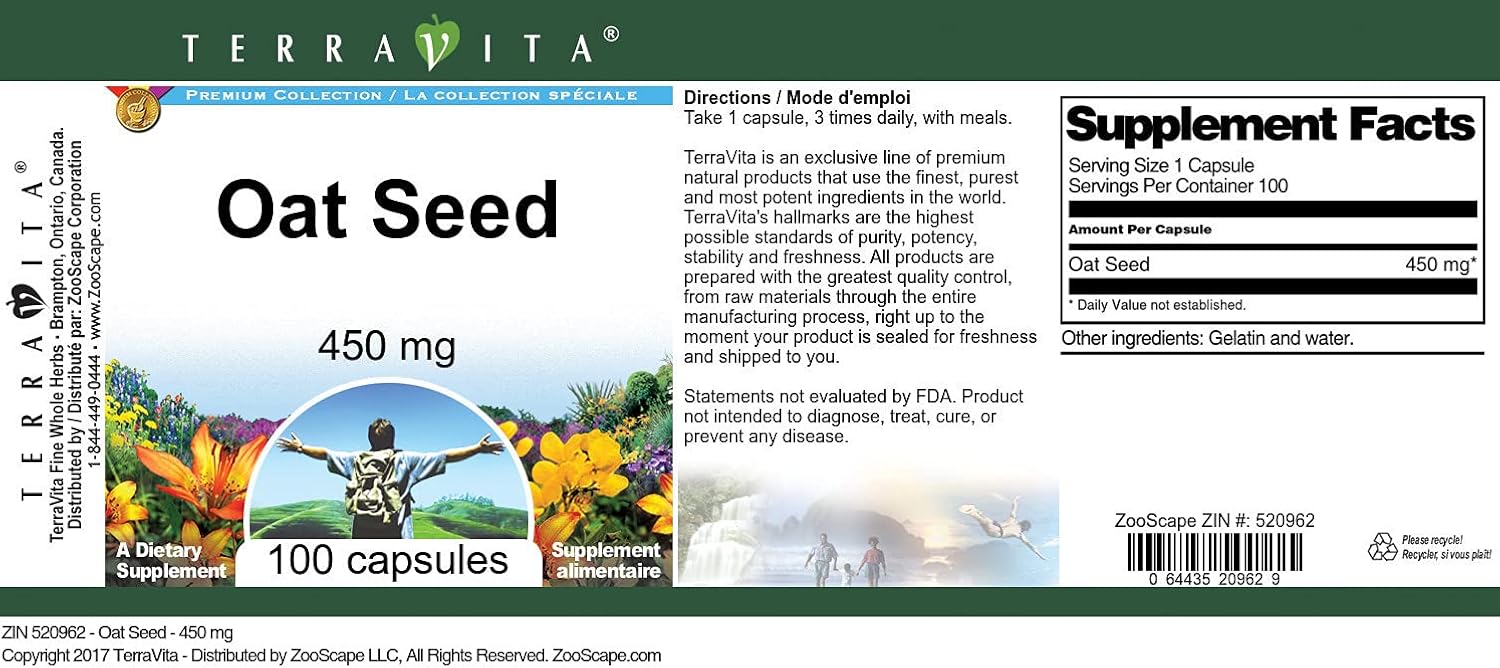 Oat Seed - 450 mg (100 capsules, ZIN: 520962)Packaged in the United States in a cGMP certified facility (current Good Manufacturing Practice).No fillers.Manufacturer: TerraVitaSize: 100 capsulesEasy-to-swallow Capsules in a sealed bottle.Ingredients: Gelatin, Water, Oat Seed - 450 mg
