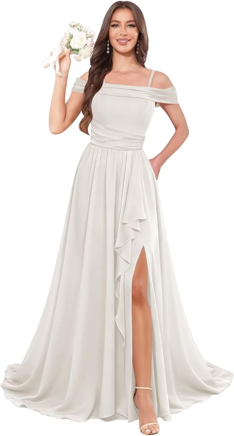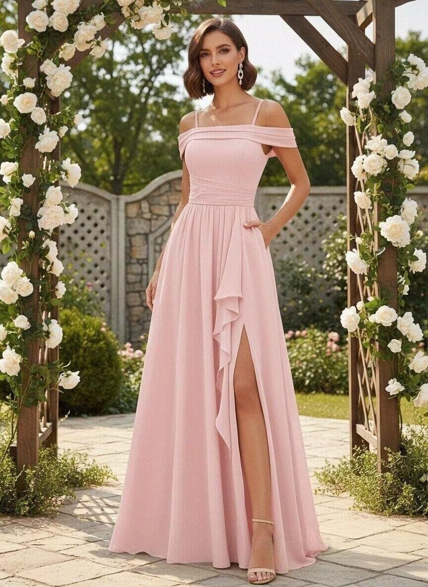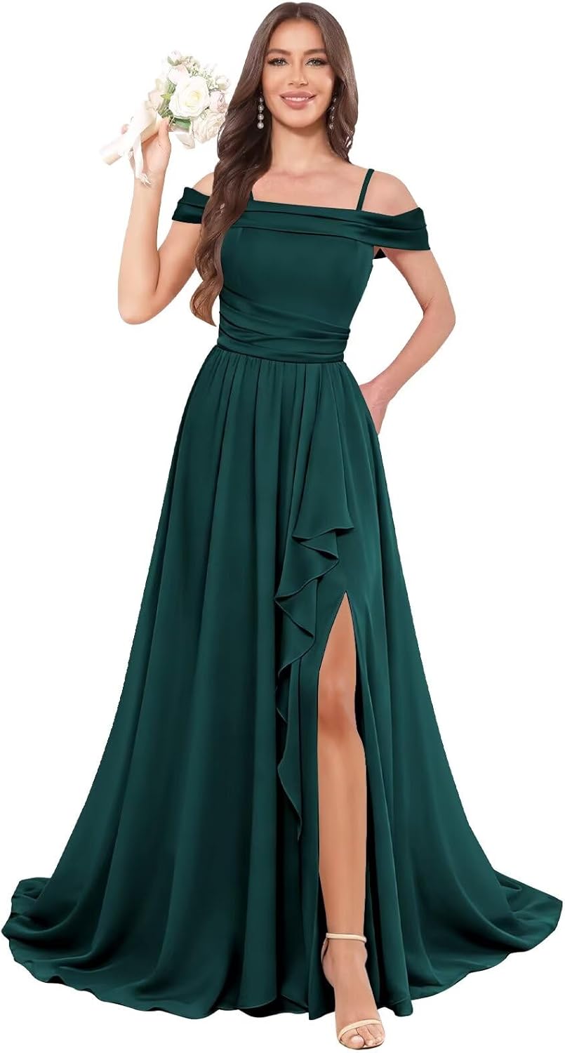 | Embellishment Feature | Ruffle, a line, long, off shoulder, slit |