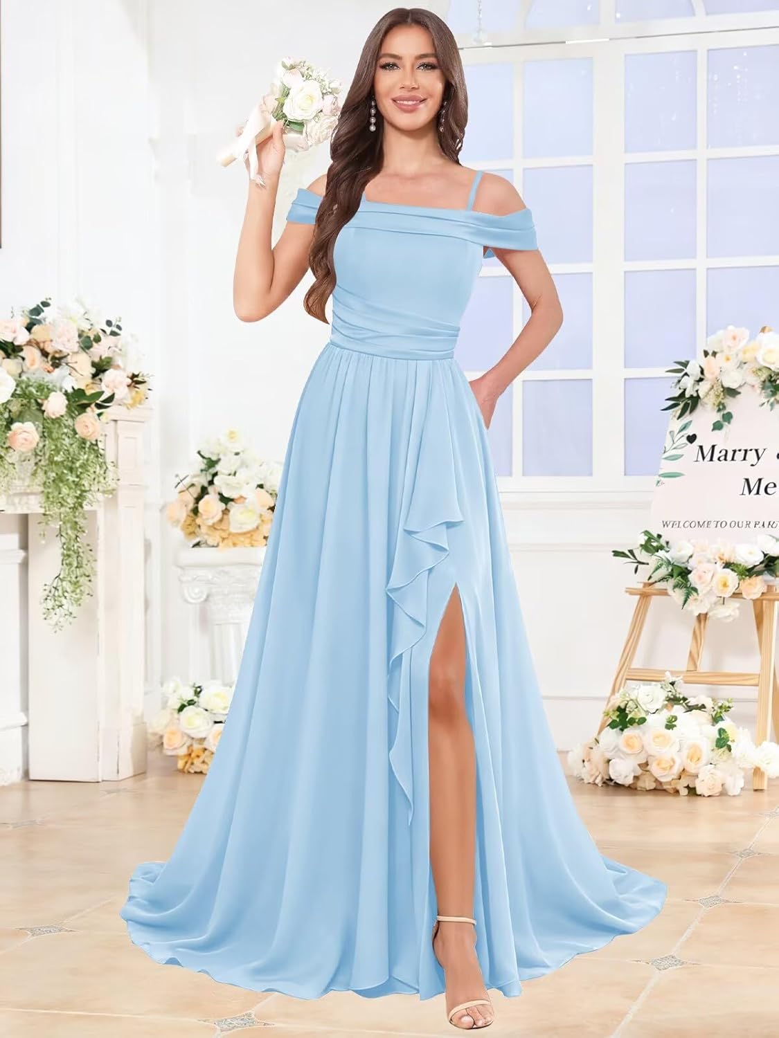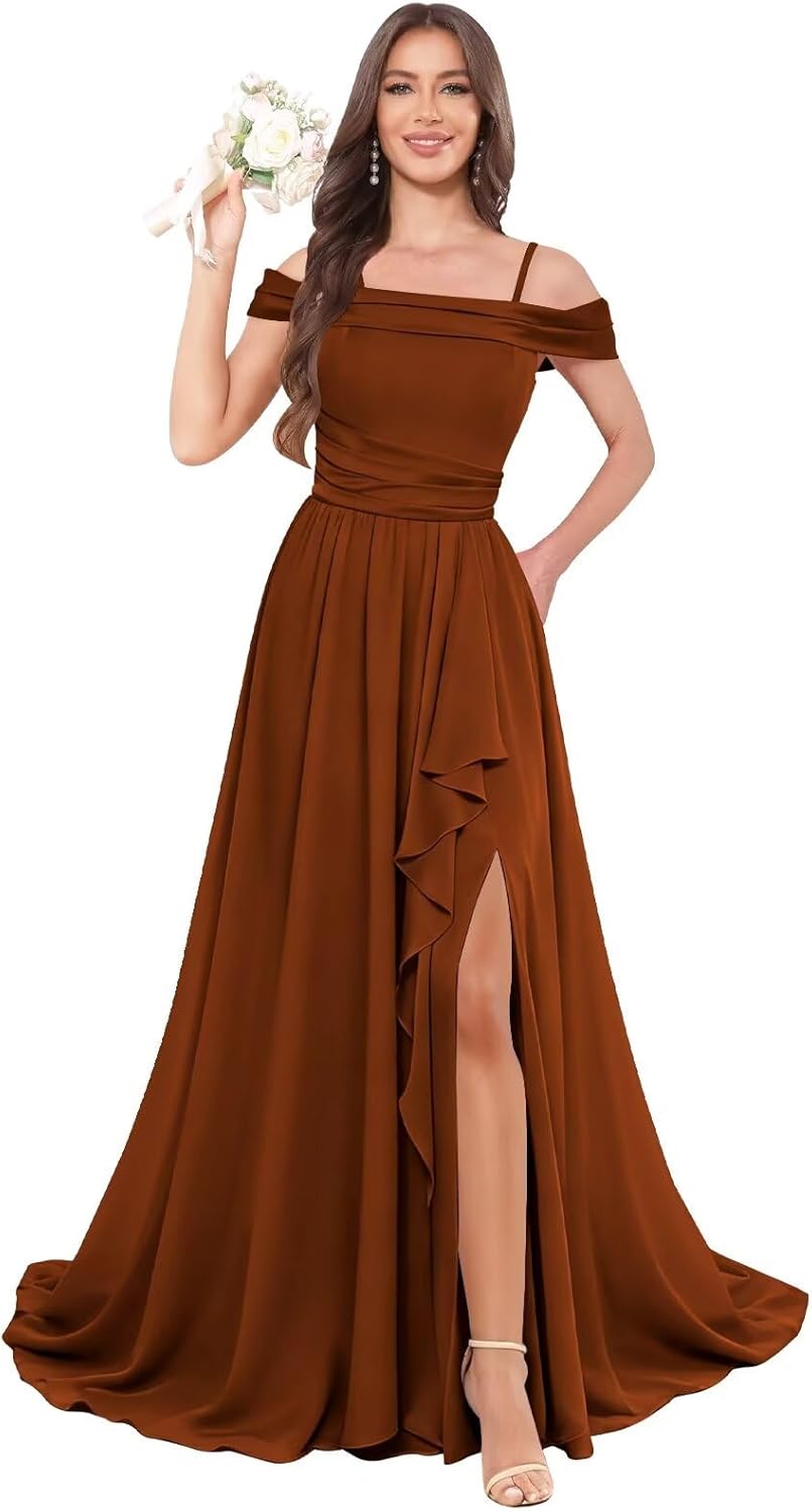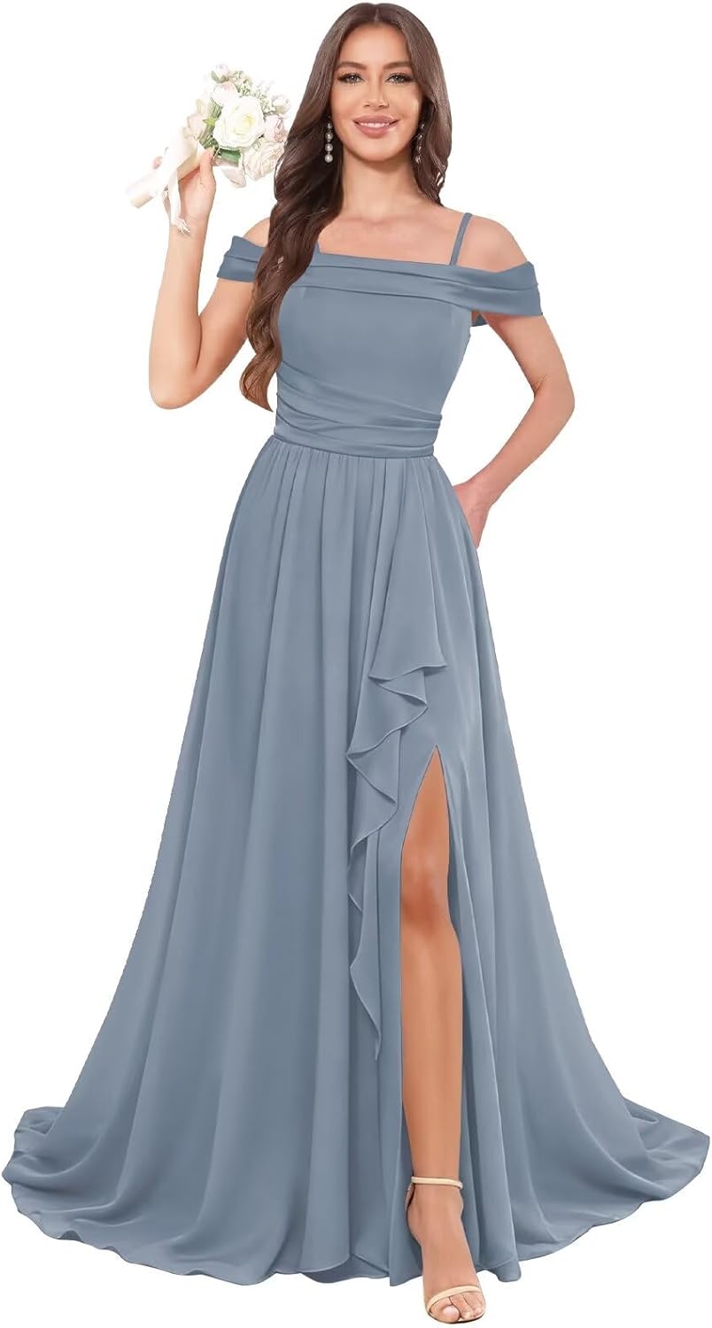 | Embellishment Feature | Ruffle, a line, long, off shoulder, slit |