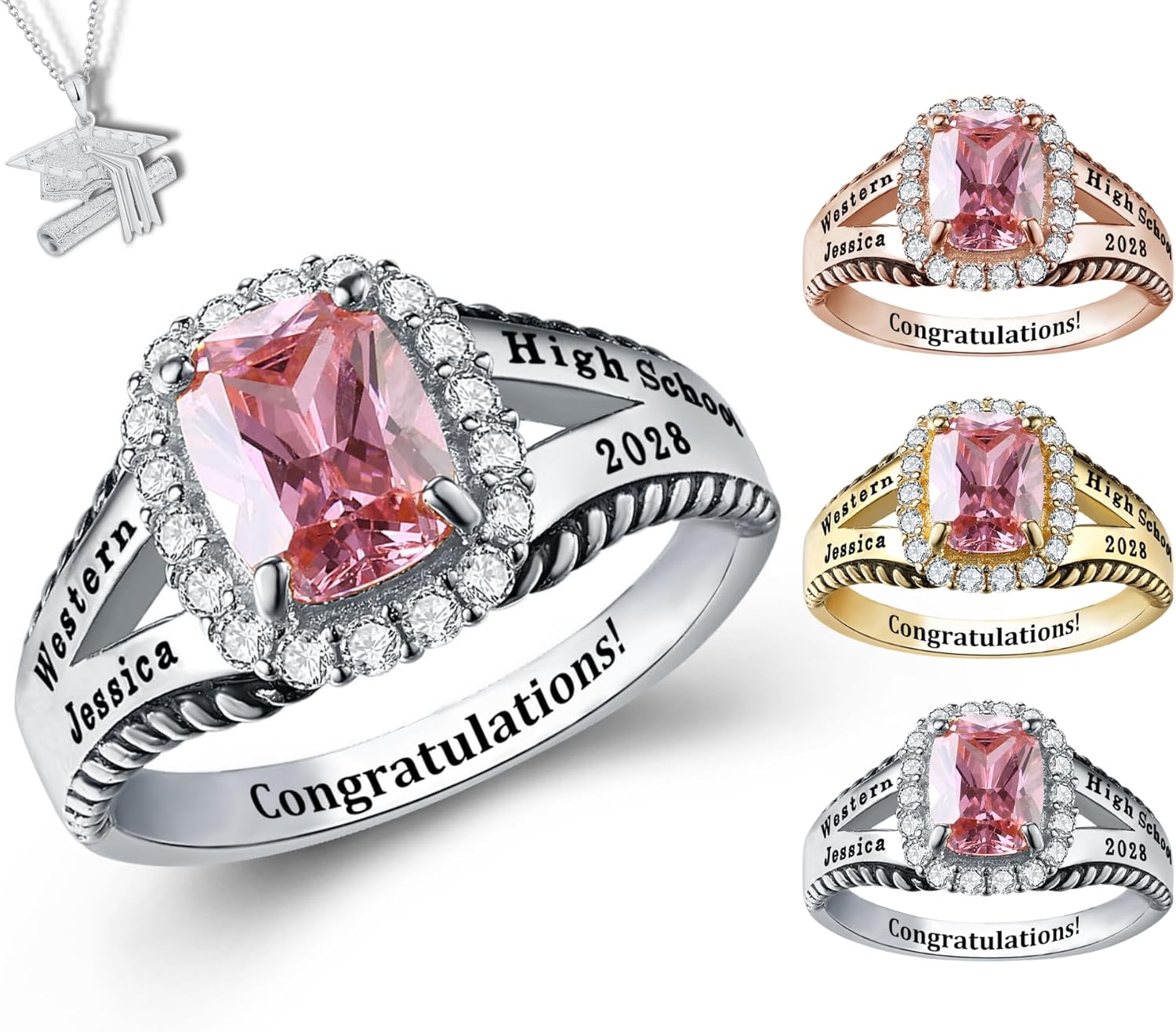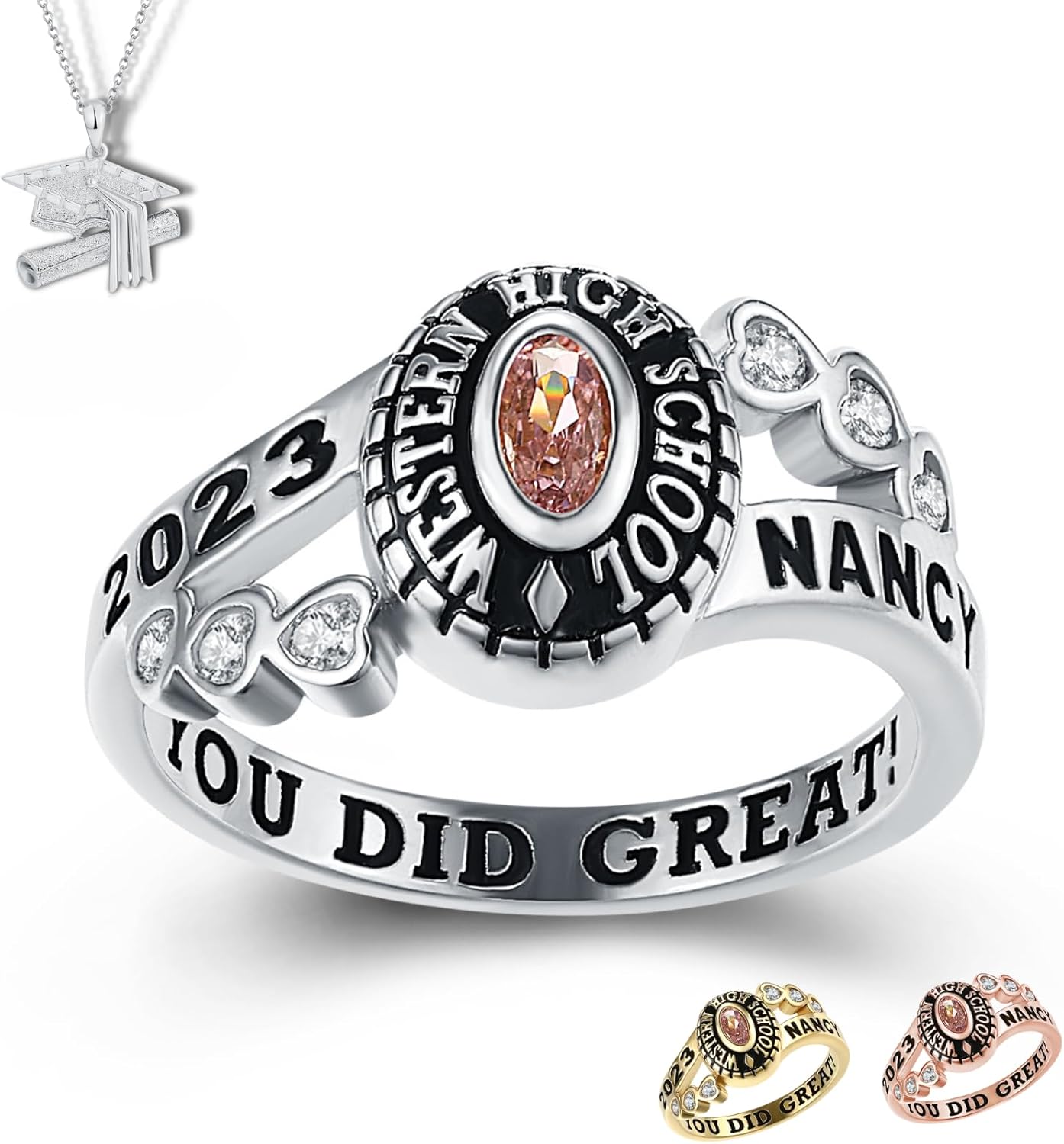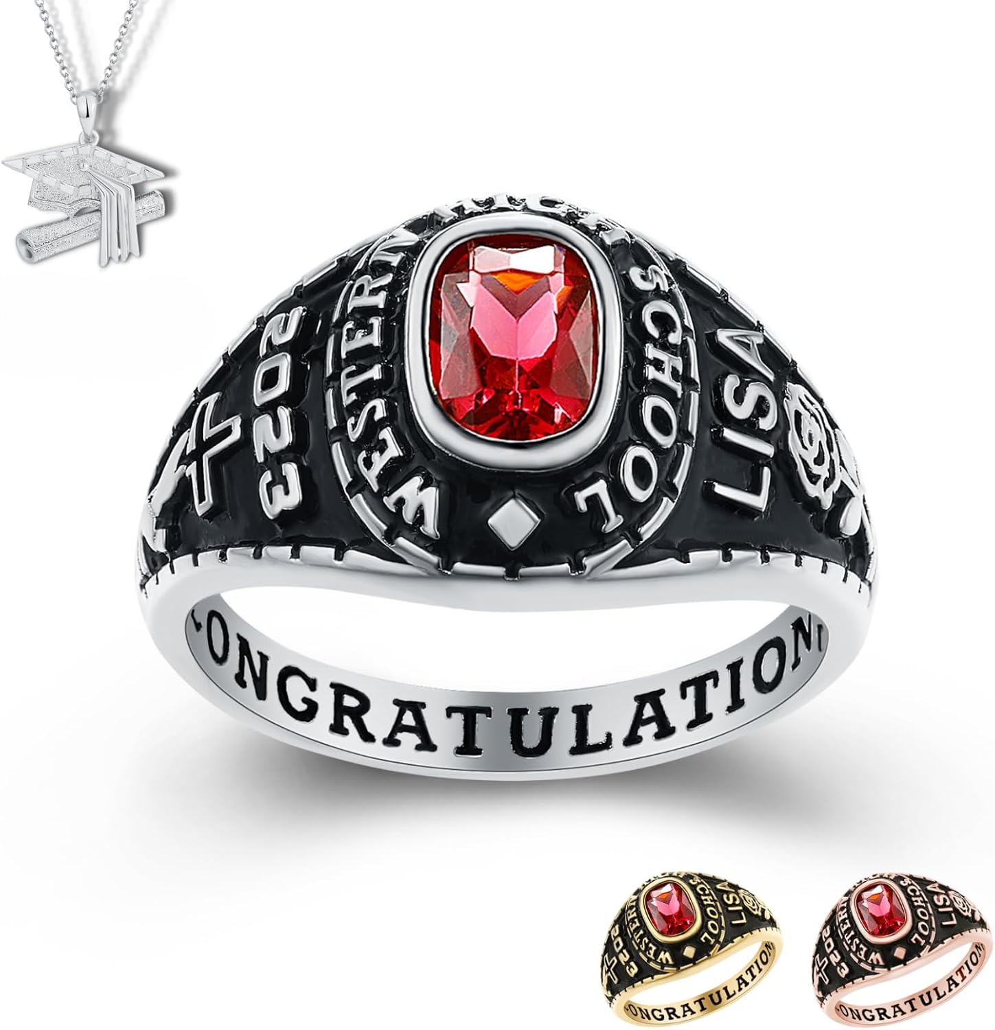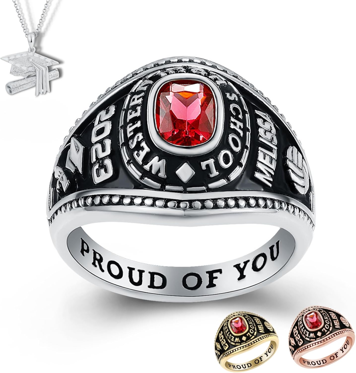 Celebrate your achievements with our stunning class rings for women, perfect for marking your graduation from high school, college, or university. Our rings are thoughtfully designed and can be customized to reflect your personal journey. Choose from a variety of styles and finishes to create a personalized piece that showcases your school pride and accomplishments. Whether you’re looking for a timeless keepsake or a stylish accessory, our graduation rings for women are crafted with quality and care, making them the perfect memento of your academic success.