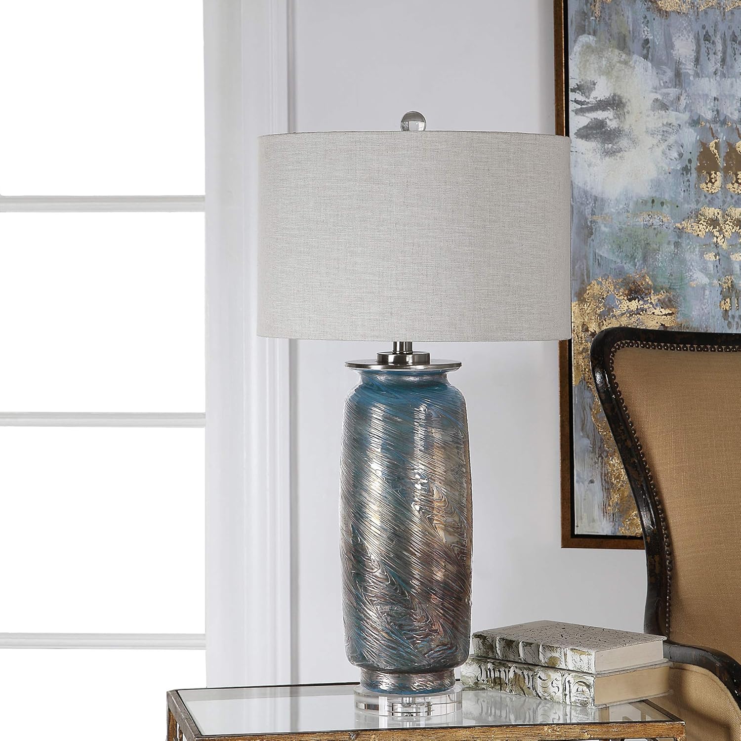 This Table Lamp Features A Decorative Glass Base That Showcases A Unique Swirl Texture, Highlighting Shades Of Ocean Blues, Greens And Metallic Bronze. Accenting These Vibrant Colors Are Brushed Nickel Plated Details And A Thick Crystal Foot. The Round Hardback Drum Shade Is A Light Beige Linen Fabric With Natural Slubbing.