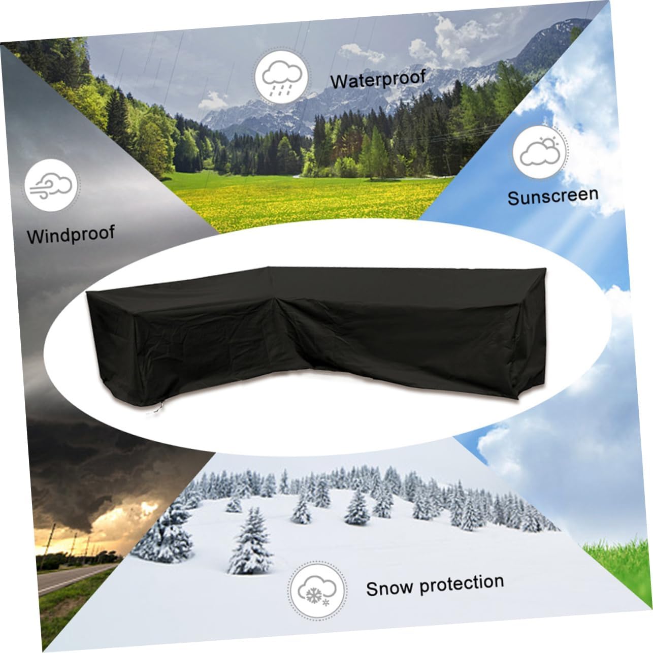 Package Include 1 x Patio Sofa Cover Features -Material:210D Oxford cloth sectional couch covers -Color:Black couch cover -Size:286.00X286.00X82.00cm/112.40X112.40X32.23in protective cover for outdoor furniture - Simple design, practical in use, simple drawstring design for easy to seal and open sofa cover. - The cover and your outdoor furniture from fallen leaves, scratches covers for sectional sofa. - It can be a good housewarming present choice for your friends, they will like it very much sectional sofa cover. - Outdoor sofa cover is made of 210d oxford fabric which is weather-resistant, wear resistant sofa protector cover. - Humanized drawstring, help the cover fit perfectly and prevent the cover from being blown off in windy days. cover for couchGoods Informationpatio sofa covers It your sectional sofa well when not in use.corner sofa cover Made of 210D Oxford cloth material for practical and reliable use.sectional couch covers Stylish design in simple color ensures its wide application in bar, home, patio, garden, yard, backyard, etc