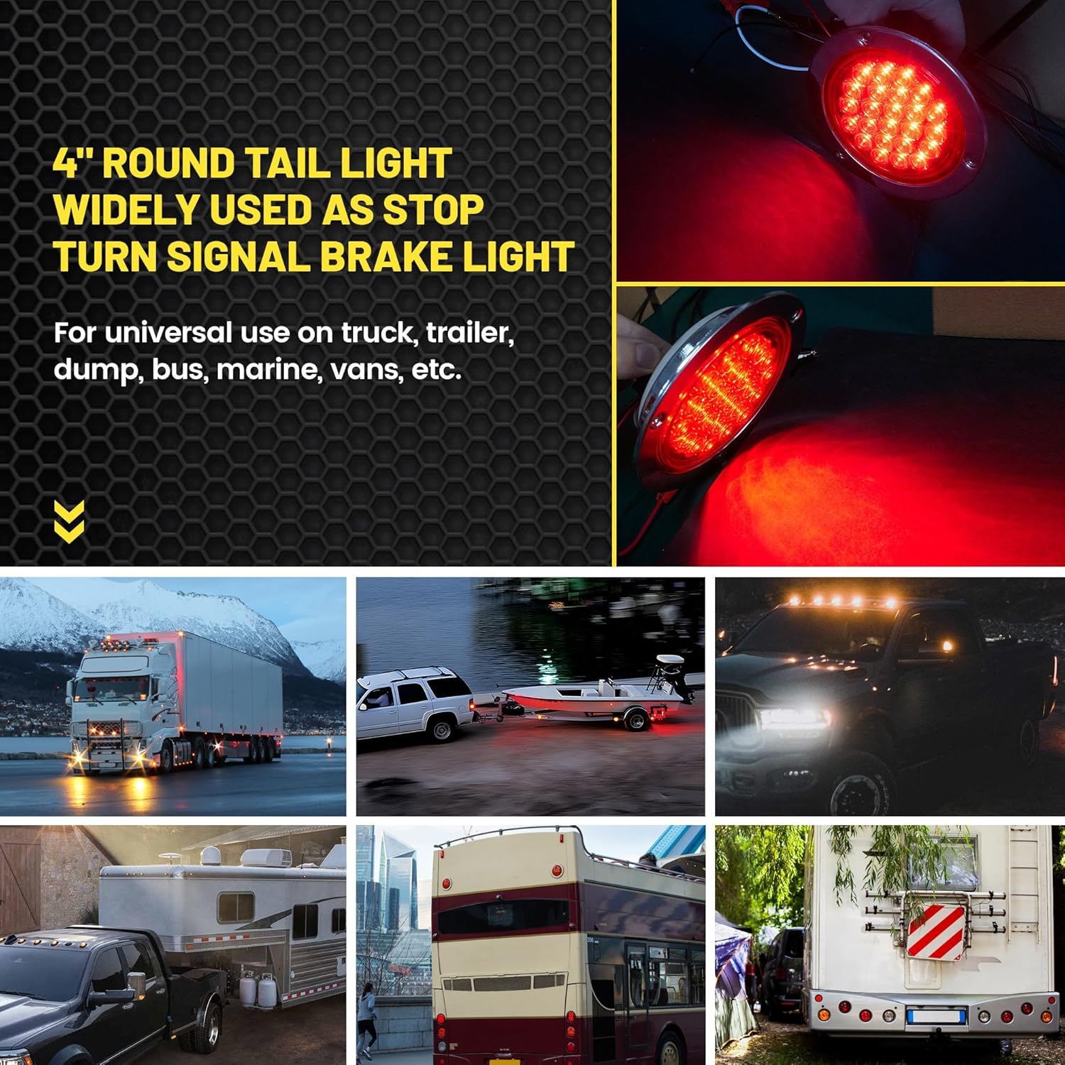 2 pcs 4 inch round tail lights led clear red can be used for: tail light, brake light, and turn signal light. Round led trailer lights is applicable to most 12V DC system like trucks, trailers, tractor, engineering vehicles,buses, vans, pick up trucks, semi trailer. High quality led with chrome plated stainless steel bezel add beauty and practicality. This 3 prong pigtail wire is vital electronic plug for LED taillight upgrades, perfect replacement for the existing plug. 3-wire light wiring has a male plug on one end that fits with the female connection on the back of your taillights.