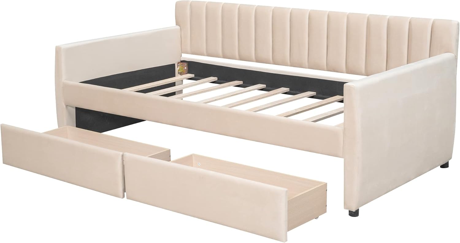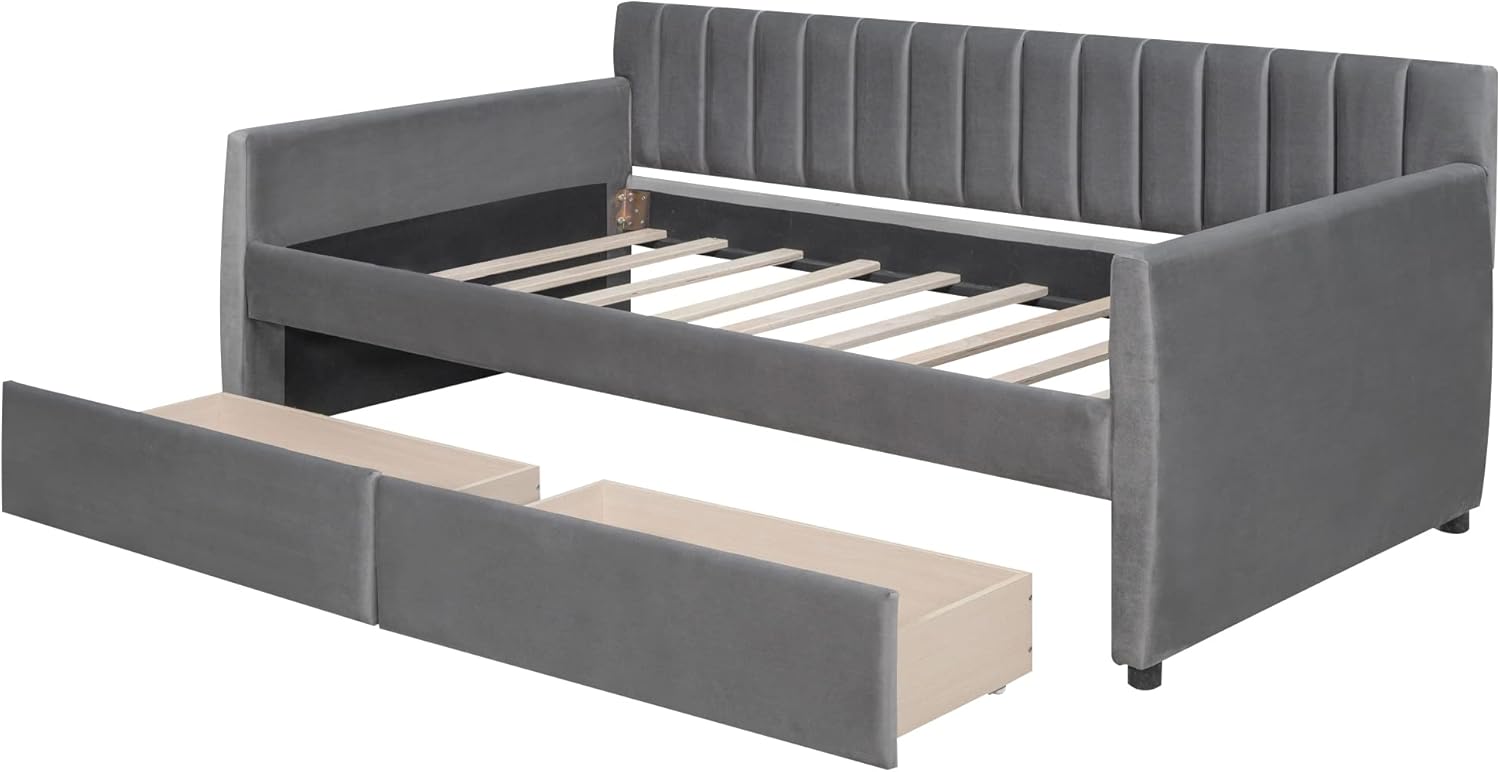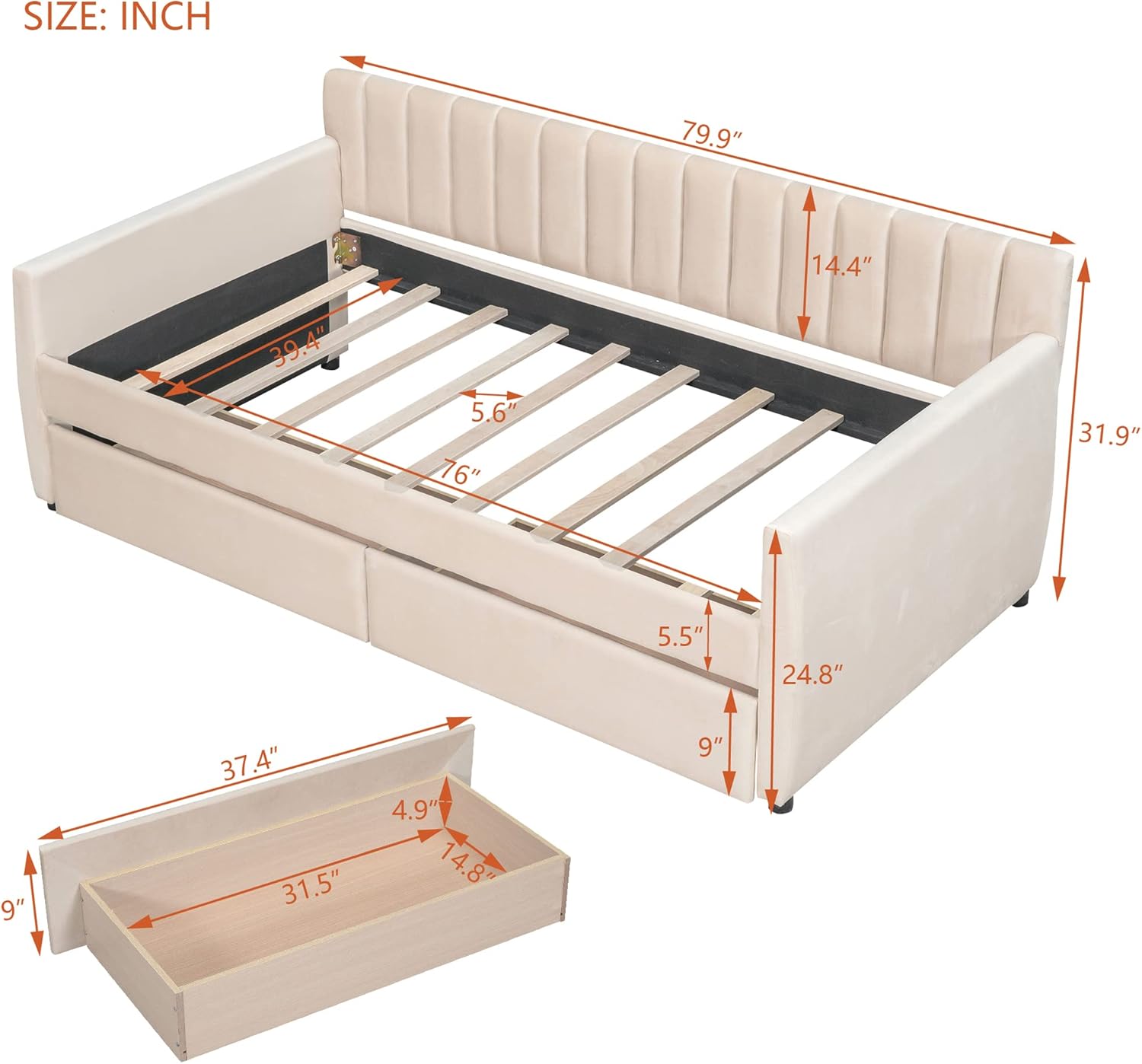 ✦Flash point:v [Maximized space] A pair of drawers under the daybed provide ample storage for your little one’s toy’s and bedding. Such a versatile piece, bringing functionality, versatility, and style to your home, perfect for those who have lots of visitors.v [No Box Spring needed] This daybed frame comes with sturdy wooden slats. Mattress is not included. A comfy velvet fabric and two armrests that bring you and your family a cozy feeling.v [Health and Comfort] The simple yet elegant wood frame is sturdy and comes with wood slats for extra support and ensures air moves freely around your mattress to keep it fresh for years to come. Built-in smoothly casters , easy for you to pull out of the drawers. Weight & DimensionsOverall Product Dimension: 79.9"L x 41.3"W x 31.9"HNumber of Package: 2Overall Product Weight: 98 LBSPackage Weight: Please refer to the SpecificationWeight Capacity: bed: 400LBSRecommended Mattress Thickness: 8"Product Type: daybedMaterial: Plywood+FabricBox Spring Required: NoAssembly Required: Yes