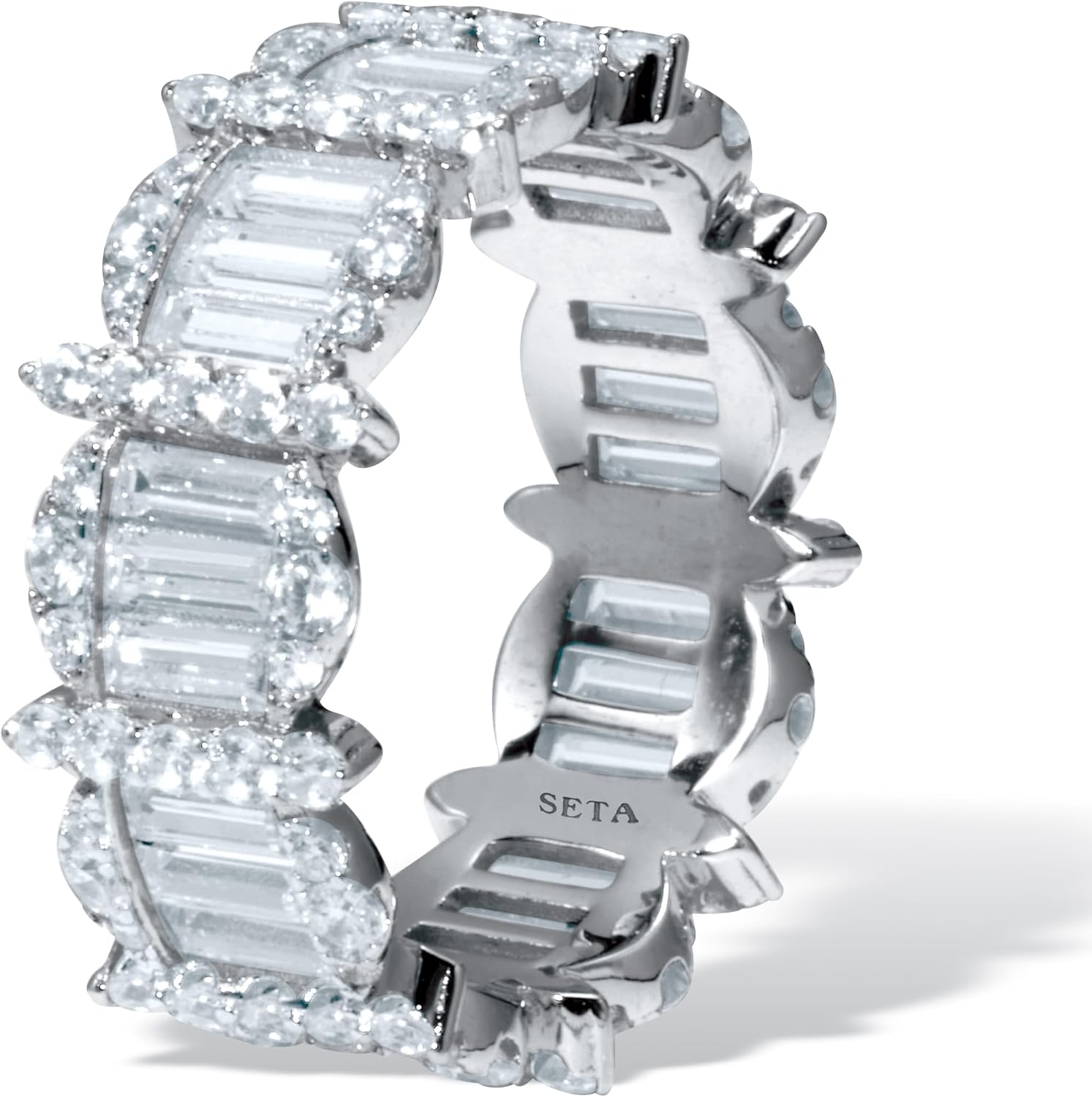 Show off the megawatt sparkle of this gorgeous eternity band! Adorned with round and baguette-cut cubic zirconia stones, this ring is sure to become a favorite. Ideal for everyday wear. 3.53 carats T.W. Silvertone. Sizes 6-10.