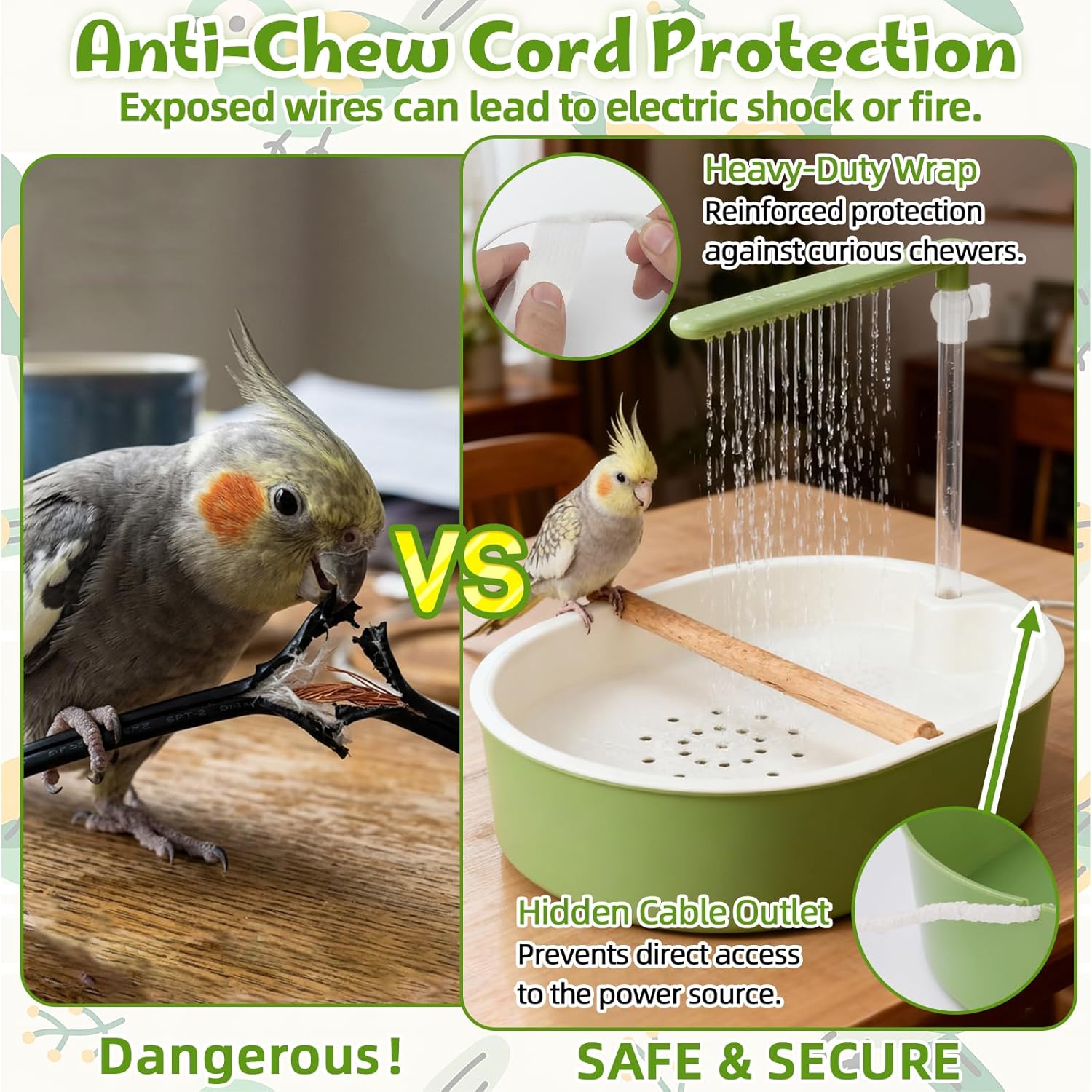 | Directions | 1. Install the toy accessories and the pump. 2. Fill the basin with enough water to ensure the pump is fully submerged (Important: Do not run the pump without water). 3. Connect the power supply and turn on the switch. 4. Rotate the valve on the shower tube to adjust the water flow speed according to your bird's preference. |