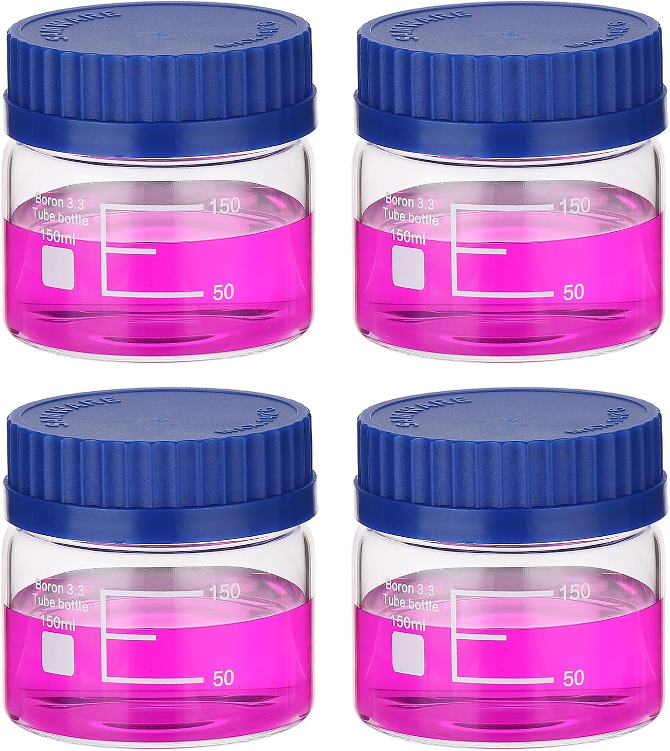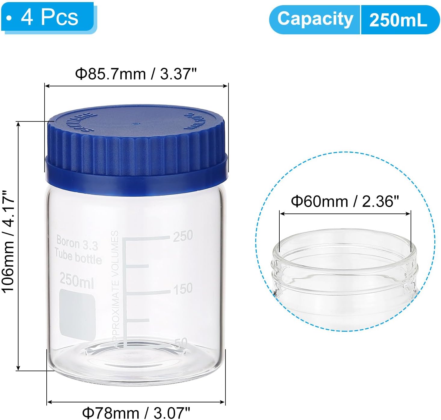 Leakproof: Our Media Storage Bottles are designed with a smooth bottle mouth that perfectly fits the GL32 screw cap, ensuring a tight and secure seal. This leakproof feature prevents any liquid from spilling or leaking out of the bottle, minimizing the risk of evaporation and exposure to external elements.Easy to Read: Package includes 4 pack Media Storage Bottles with a capacity of 250ml, featuring a graduated white printed scale, providing precise measurement and accurate volume readings. The smooth surface of the bottle allows for easy cleaning and ensures clear visibility during experiments or storage.Durable Material: Made from borosilicate glass, which is excellent durability and heat-resistance. They are chemically resistant and maintain their transparency even after repeated use. The thickened bottom adds to their durability and ensures long-lasting performance.Large Marking Area: These bottles are suitable for storing media, reagents, and other liquid solutions in laboratory, experimental, or home settings. The large marking area allows for easy identification and labeling of contents, facilitating efficient organization and retrieval.Screw Cap: The screw caps of our Media Storage Bottles are made from durable polypropylene (PP). They exhibit excellent resistance to high temperatures and corrosion, with a maximum temperature tolerance of 140 degrees Celsius. The secure screw cap design ensures airtight sealing and protection of stored liquids.