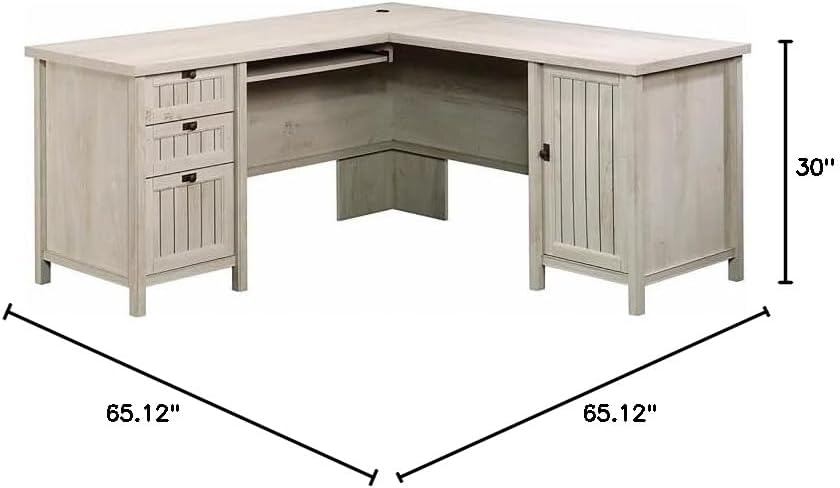 Take your home office on an island-inspired getaway with this L-shaped desk from the Pemberly Row collection. This beautiful desk offers a spacious tabletop surface that provides you with room for all your must-have office essentials - laptop, collection of notepads, desk lamp and your favorite coffee mug. It features a slide-out keyboard/mouse shelf that opens and closes on smooth metal runners. It also features two easy gliding storage drawers along with a lower file drawer with full extension slides to hold letter or legal size hanging files - talk about organization! Behind its framed door is an additional hidden storage area that includes an adjustable shelf and can also accommodate a vertical CPU tower. Each drawer and door front is framed and detailed with a slat-front to give it that costal vibe. Other features include a desktop grommet hole for cord and wire access. Finished on all sides in Chalked Chestnut, this eye pleasing desk will give your office a fresh new look.Features:- Material: Engineered wood- Finish: Chalked chestnut- Durable, 1" thick top.- Slide-out keyboard/mouse shelf with metal runners and safety stops.- Three drawers; lower drawer with full extension slides holds letter or European size hanging files to keep you organized.- Storage area behind door features an adjustable shelf and holds a vertical CPU tower.- Framed, slat-front detailing for an extra touch of style.- Finished on all sides for versatile placement anywhere in your home.- Cord management includes desktop grommet to keep your cord clutter neatly contained.- Quick and easy assembly with patented T-lock drawer system to save you time.- Meets BIFMA standard x5.5 for safety, durability, and structural performance.Specifications:- Product Dimensions: 30"H x 65.12"W x 65.12"D- Product Weight: 202 lbs- Weight Capacity: 70 lbs