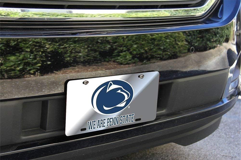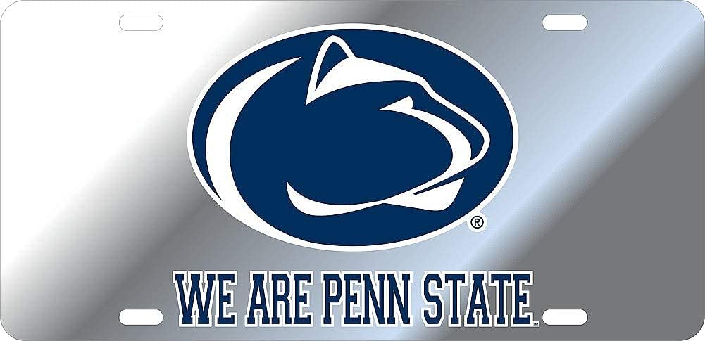 Penn State Nittany Lions License Plate and Frame Bundle Elite Fan Shop Penn State Nittany Lions License Plate Silver Mirrored acrylic with vinyl decal graphics 11 5/8” wide x 5 5/8” tall 1/8” thick Officially Licensed Elite Fan Shop Penn State Nittany Lions License Plate Frame Silver Made of zinc alloy metal Standard size of 6.25” tall x 12.25” wide & 3/16” thickness These frames leave all four corner areas of the license plate visible Officially Licensed