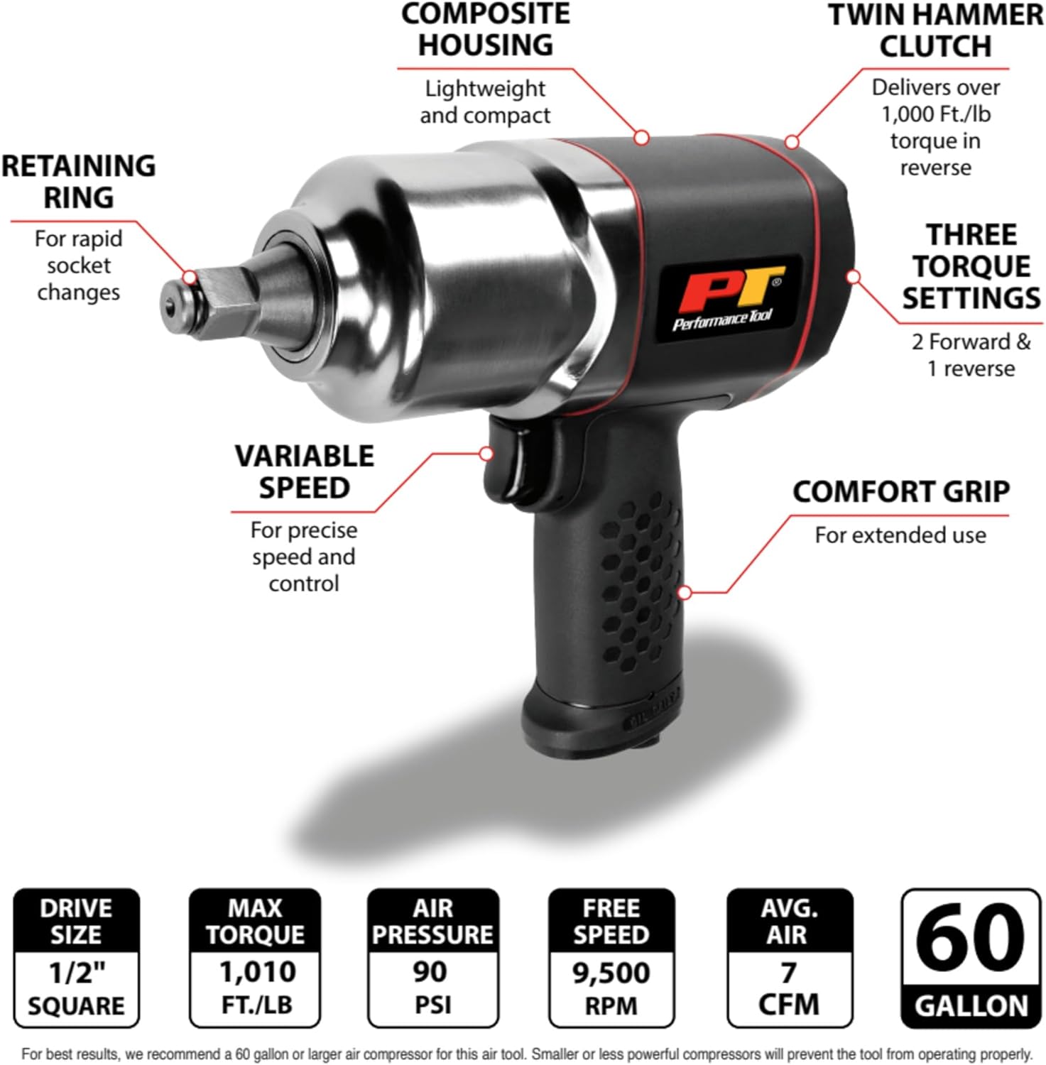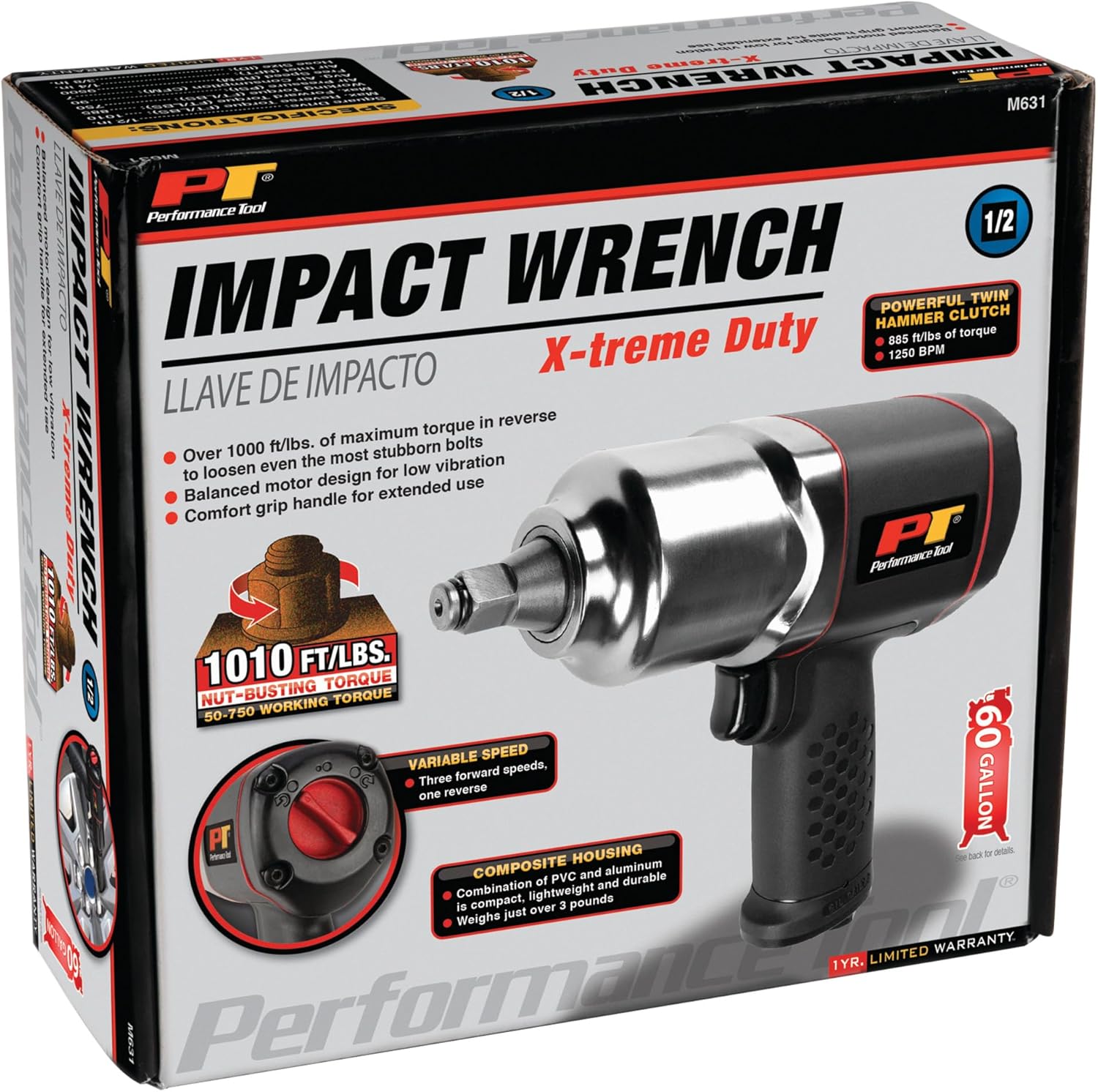 Commercial duty twin hammer clutch delivers an impressive 1010 ft pounds nut busting torque in reverse to loosen even the most stubborn bolts and 885 ft. pounds in forward for the most demanding jobs. Composite housing is lightweight, compact and cuts down on user fatigue. Variable speed and torque settings with two forward and one reverse. Balanced motor design for low vibration and comfort during extended use. Specifications: 1/2" Drive, Max Torque: Reverse - 1010 Ft/Lbs, Forward: 885 Ft/Lbs, Working - 775 Ft/Lbs in 5 seconds, Free Speed: 9500 RPM, BPM: 1200, Air Pressure (PSI): 90, Avg CFM: 7. Air Inlet: 1/4", Hose size: 3/8" ID, Rec. max bolt size 7/8". Weight: 4.95Lbs.