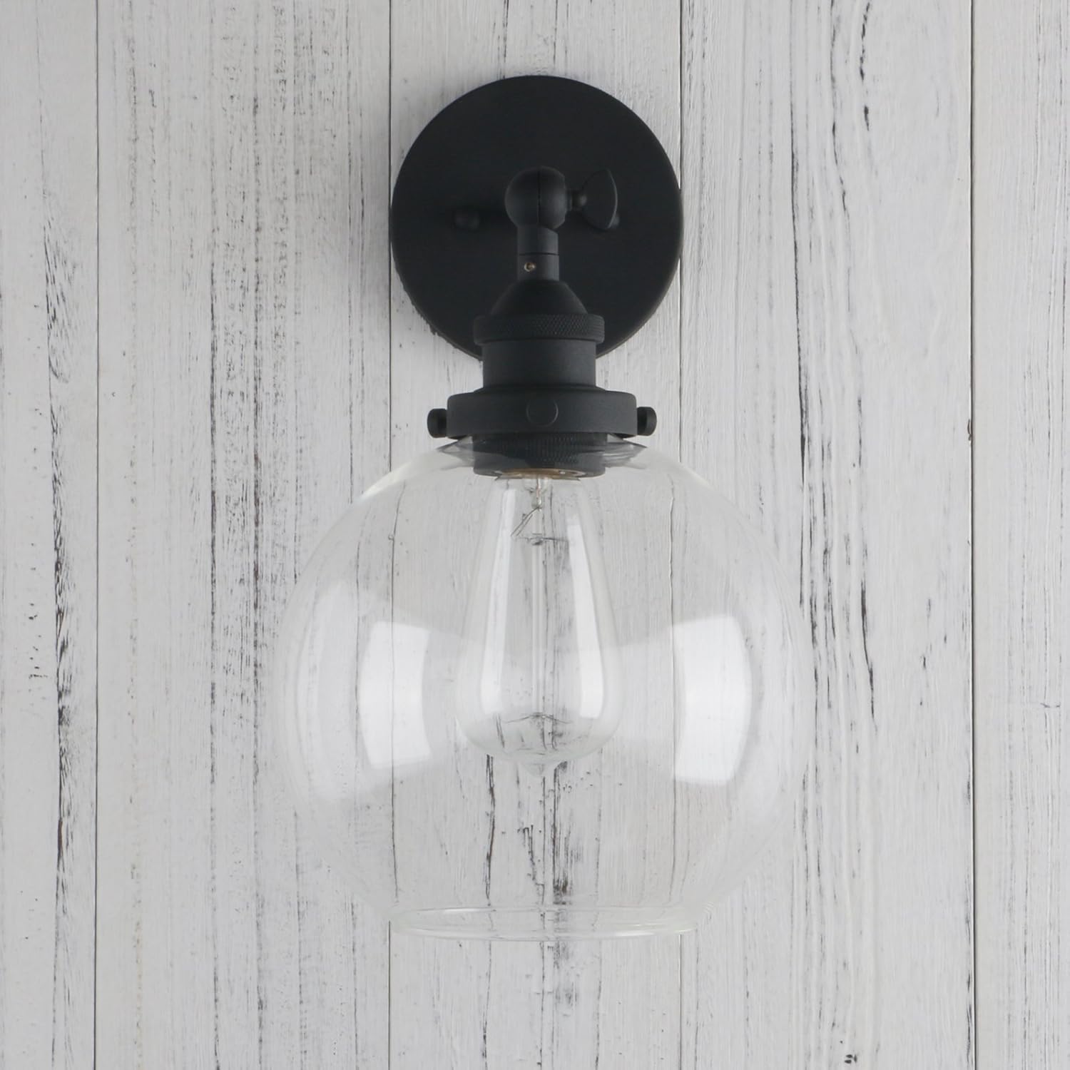 Permo Wall Sconce Vintage Industrial 1-Light Rustic Wall Mount Light Fixture with 7.9" Round Clear Glass Globe Shade (Black)