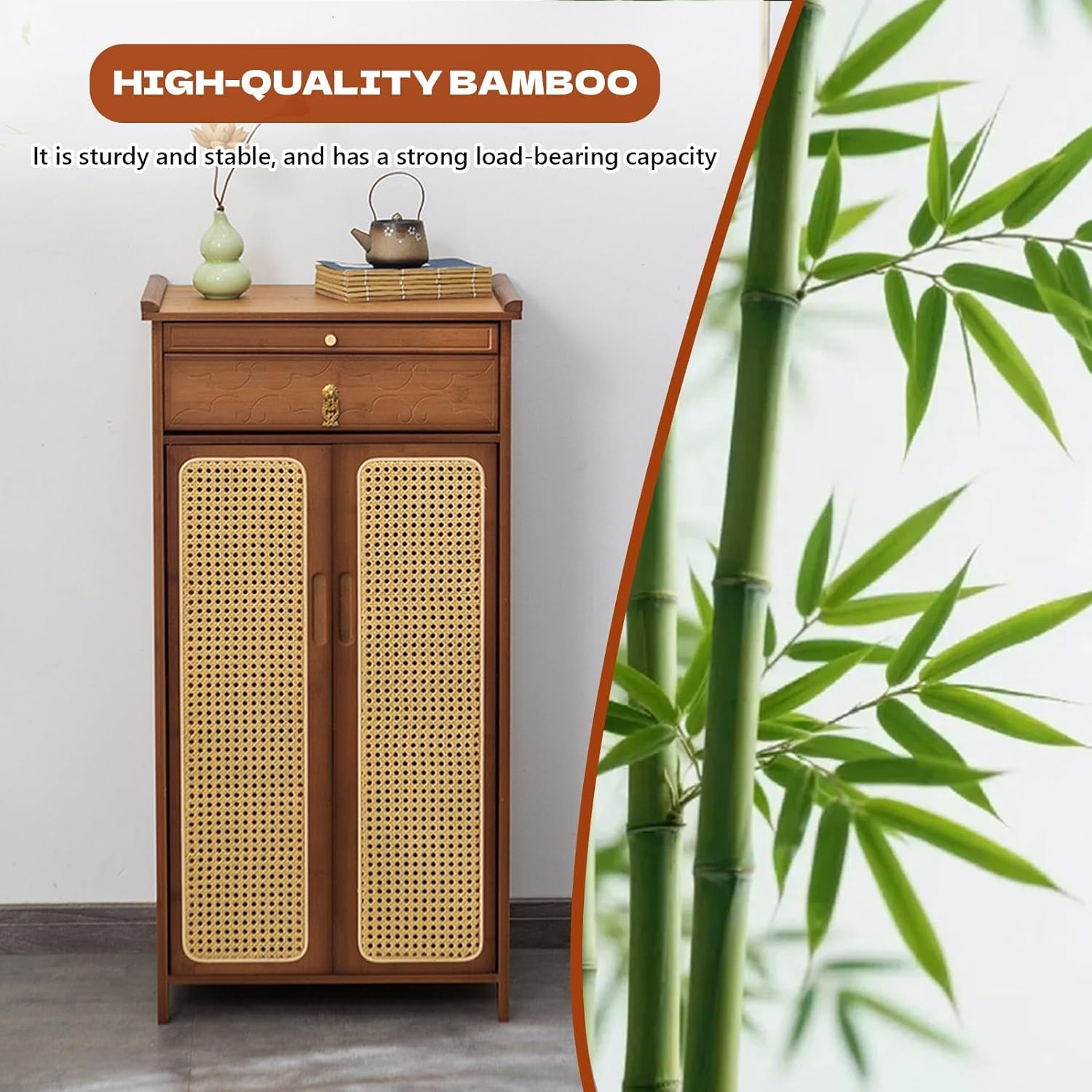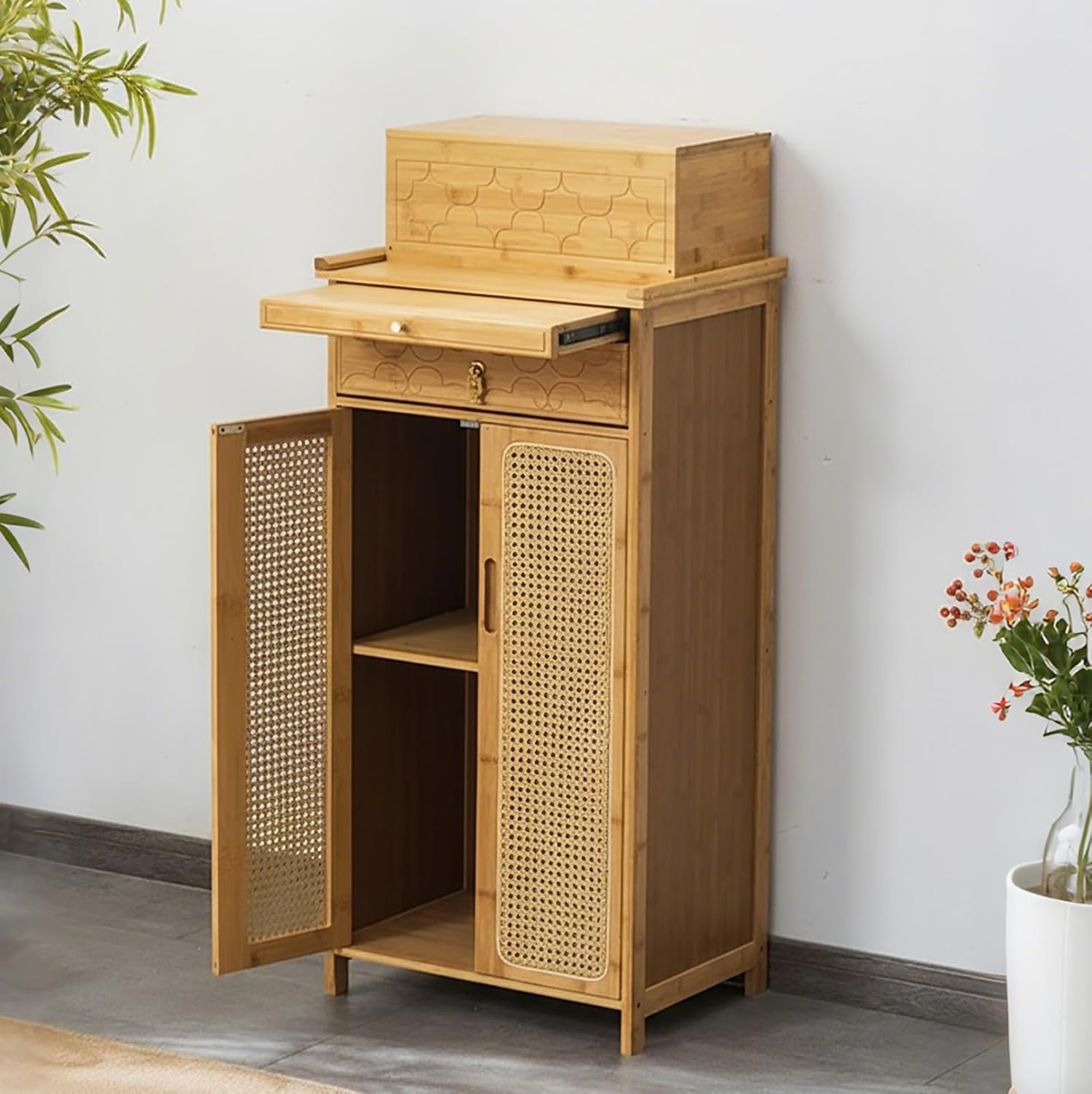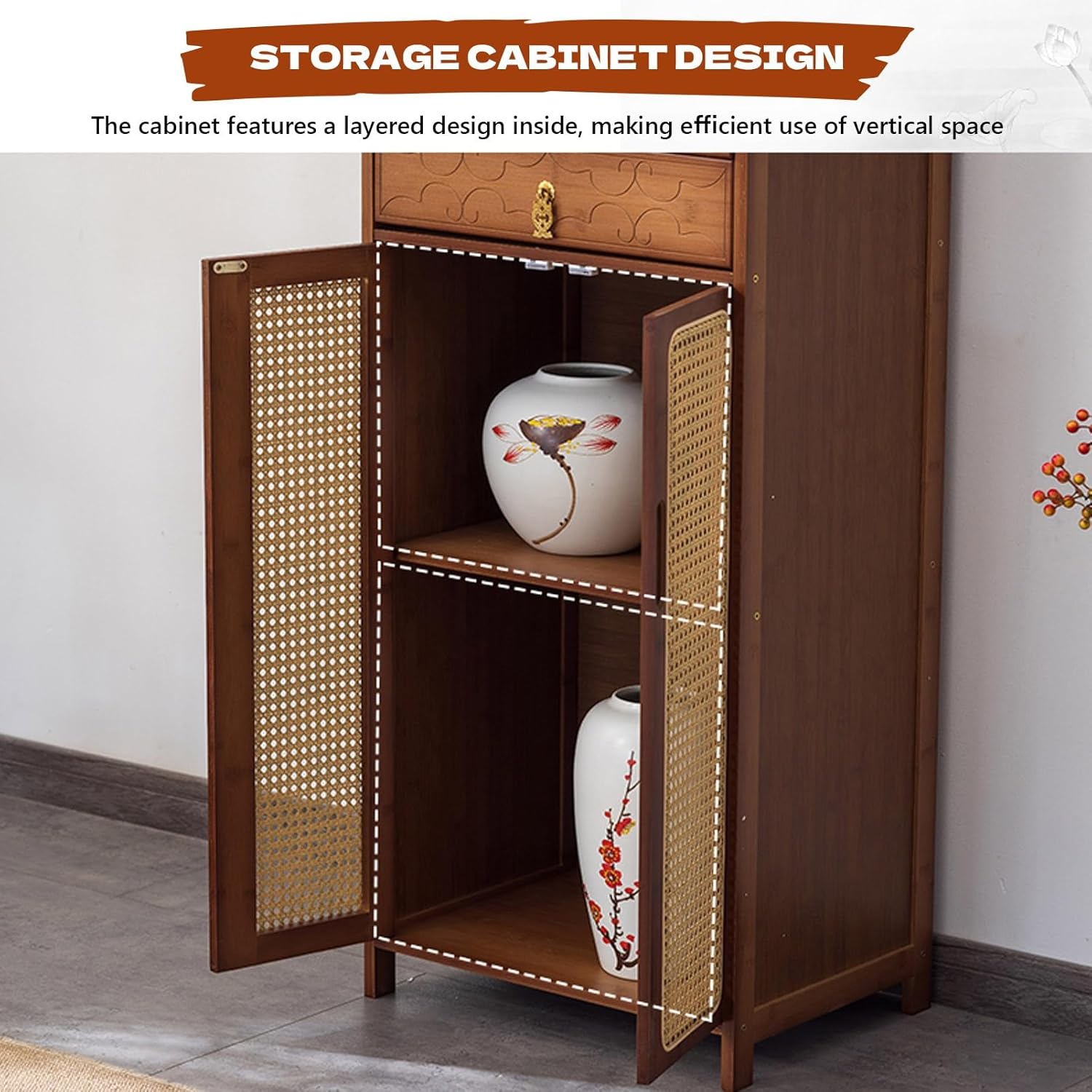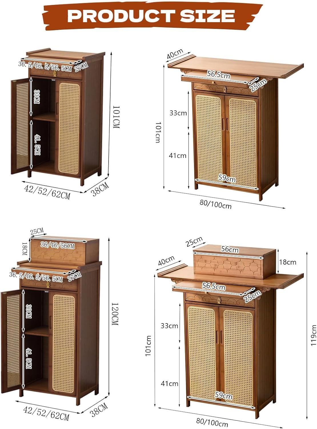 This storage cabinet features a drawer at the top for storing small items; the double-door cabinet design at the bottom provides storage for cushions, utensils, or everyday items, combining aesthetics and practicality.Product SpecificationsProduct Name: Buddhist Altar CabinetDimensions: 42x38x101cm , 52x38x101cm , 62x38x101cm , 80x40x101cm , 100x40x101cm , 42x38x120cm , 52x38x120cm , 62x38x120cm , 80x40x119cm , 100x40x119cmColor: Brown , WoodMaterial: Bamboo and Plastic rattanSuitable Locations: Living rooms, bedrooms, balconies, shrines, ancestral halls, and templesPackage Includes: 1x Pooja Cabinet