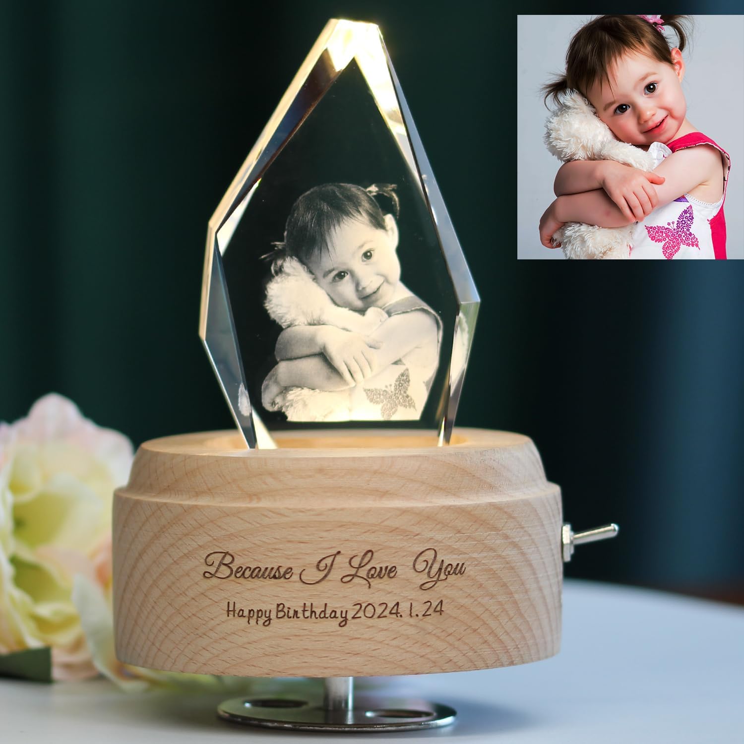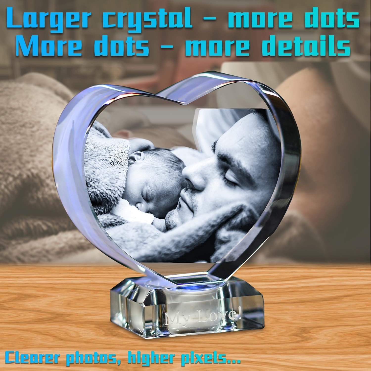 This is a crystal with a colored light base. The crystal on the base is crystal clear and shining brightly. The designer converted the photos from 2D to 3D, making them vivid and lifelike. The unique glass base can add text, which is a feature of our product. Larger crystals have more points and details, and our goal is to provide customers with high-quality service. Thank you for choosing us.