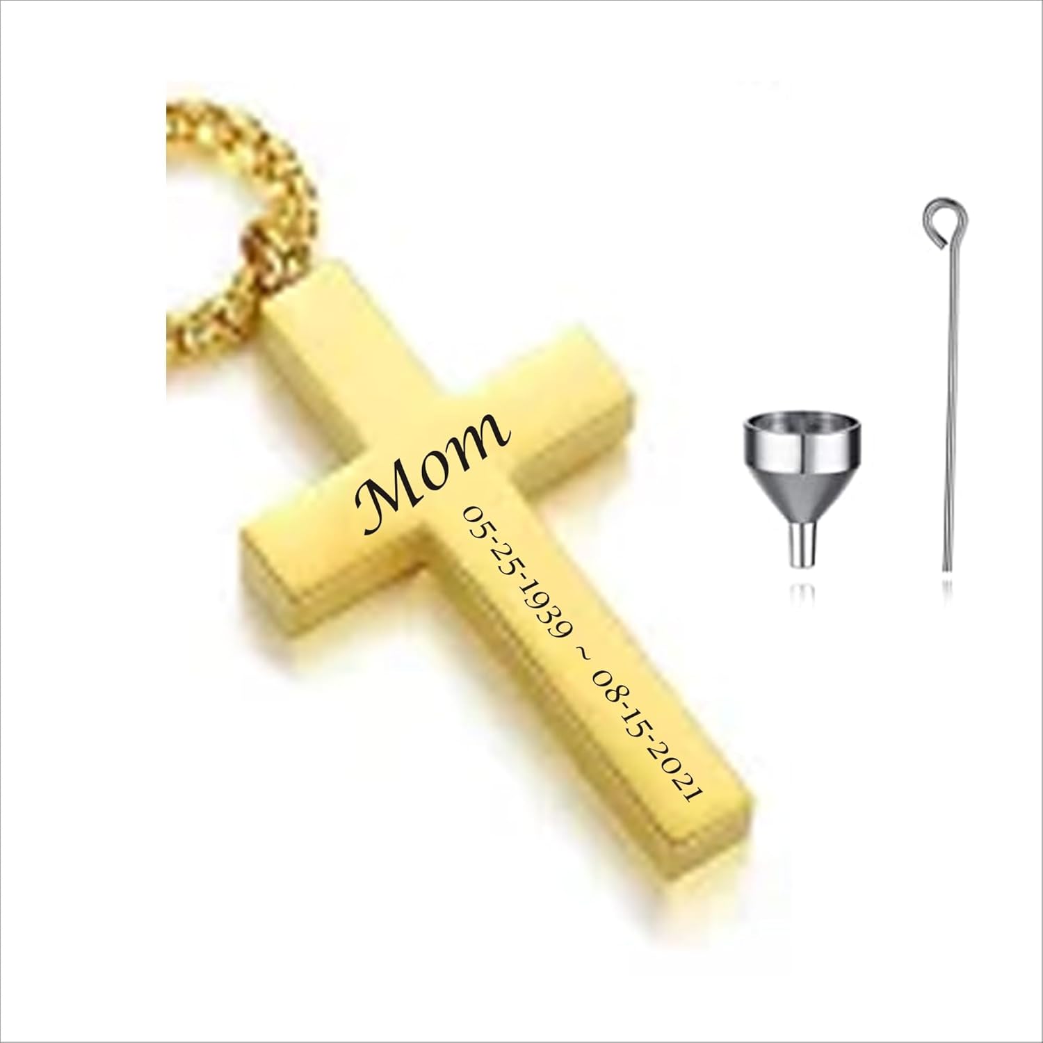 Personalized CREMATION CROSS URN Necklace Ashes Jewelry Urns Waterproof Pendant Custom Engraved Memorial Ashes Keepsake-B, S, G. Feature: SIZE: cross pendant: 1.68 "x 0.97" (3.1 cm x 1.9 cm): Cross color : Gold plated, Silver plated, Black coating . Chain length :21.5" Cross Cremation Jewelry: This ashes necklace could hold a small portions of Perfume, Hair/Fur, Ashes or something else, which will well keep memories between you and loved ones. Premium Quality: These urn necklace both made of high quality 316L stainless steel, it' s waterproof, never deform, corrode and fade. You could keep your loved ones remains safety. The necklace screw with a rubber ring to keep it waterproof. Gift: This set includes 2*velvet pouch,2* Filling kits. It is a great gift for men, gift for boyfriend, gift for dad, gift for grandpa, gift for husband, gift for mom, gift for sister, gift for girlfriend , gift for wife, gift for grandma, gift for best friend. It is a perfect gift for Valentine's day , Anniversary, Birthday, Mother's day, Father's day, Graduation , Retirement , Thanksgiving , Holidays, Christmas and so on. We supply engraving with vertical way on front , back and side of the cross , one line engraving on vertical way can be up to 23 characters including spaces , the side way can be 18 characters including spaces. please see the engraving sample from our main sample picture .