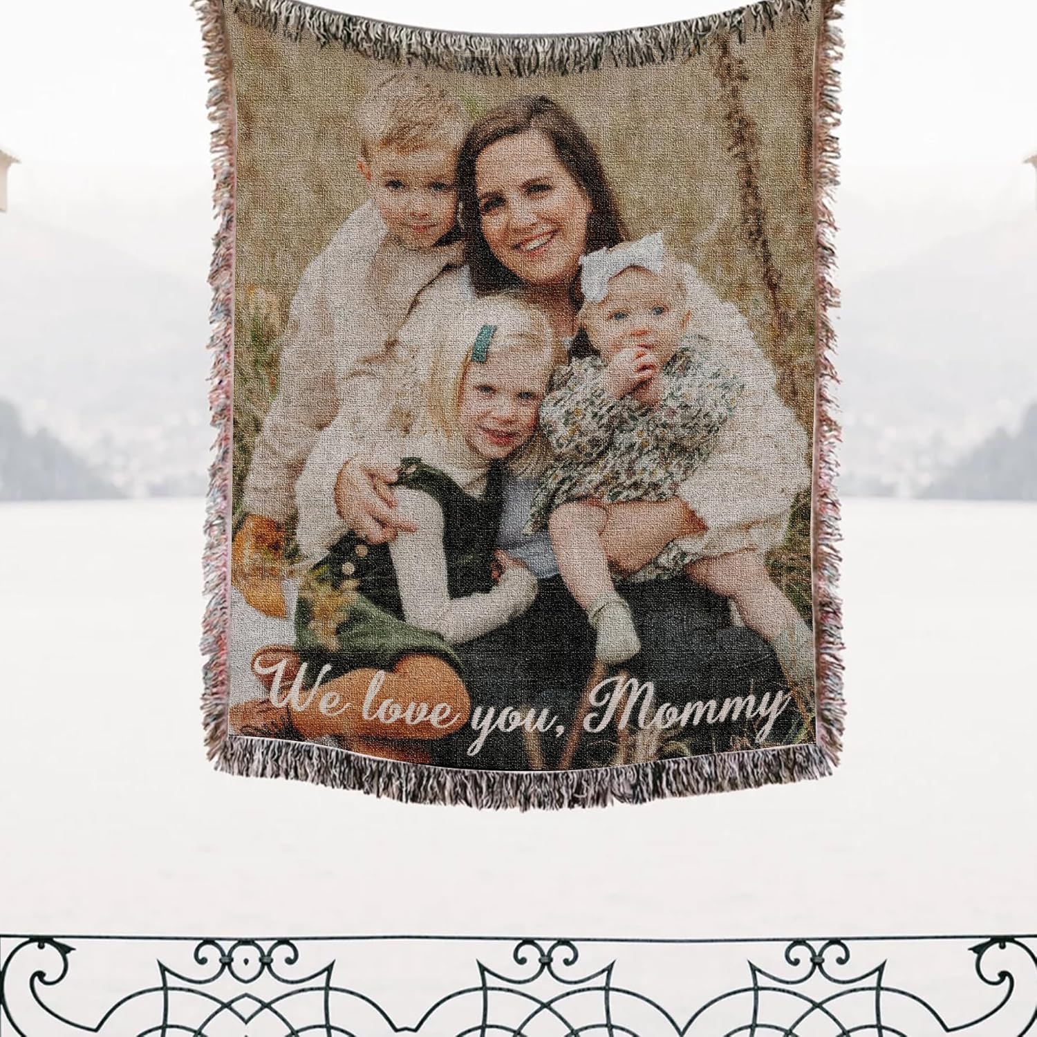 Cherish your family memories forever with this woven blanket. The vibrant, high-quality image is printed on a soft, cozy fabric, creating a warm and inviting piece for your home. Framed by an eye-catching fringed border, this blanket showcases a beautiful family portrait in a natural outdoor setting. Drape it over your couch or favorite armchair to add a personal touch and a splash of color to your living space. With its durable construction and fade-resistant printing, this blanket is designed to withstand years of use and enjoyment. Measuring approximately 50 x 60 inches, it offers ample coverage for snuggling up on chilly evenings. Celebrate the love and bond of your family with this heartwarming keepsake.