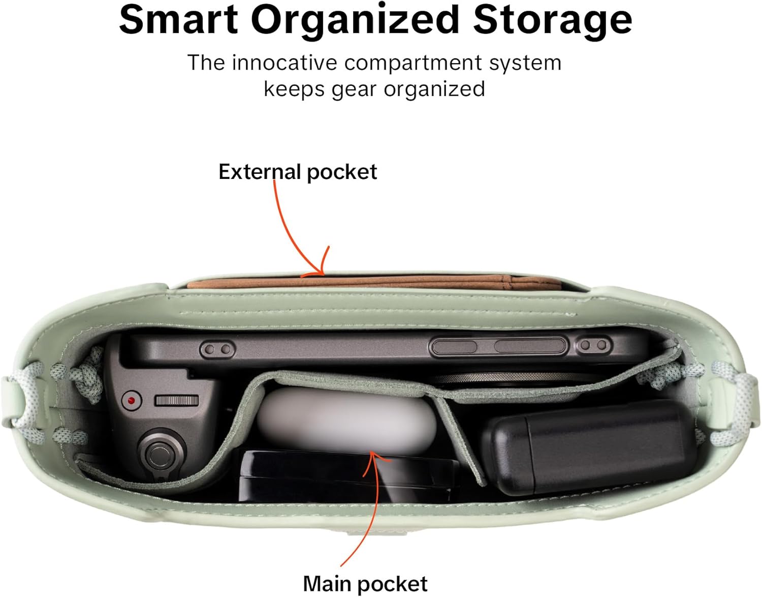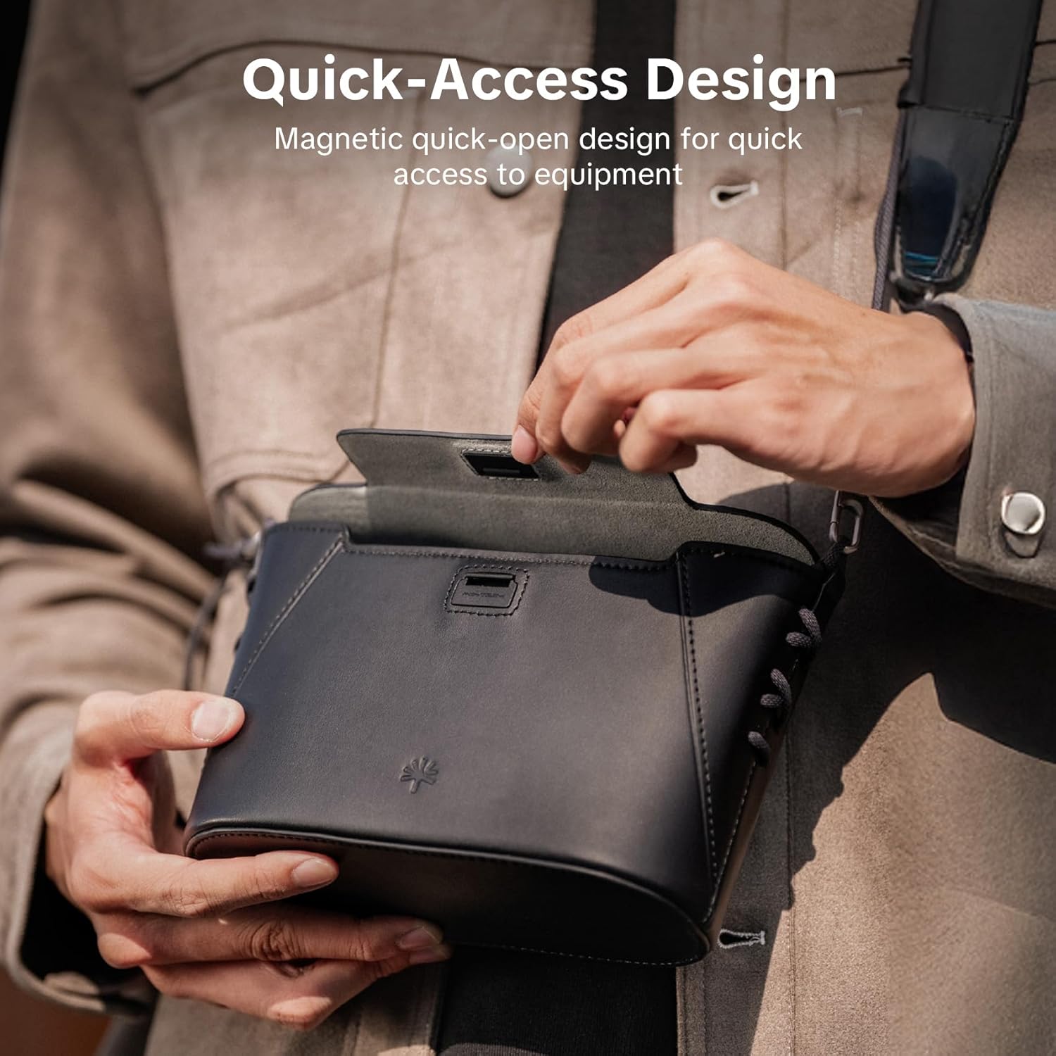 The PGYTECH OneGo Crossbody Mobile Bag is designed for mobile creators, meeting the needs of carrying a smartphone with a grip, compact cameras, and daily essentials. Constructed from premium microfiber, it features a timeless, classic retro look perfect for users who appreciate artistic styling. The bag's horizontal layout offers ample interior storage space, and its adjustable divider design allows for flexible storage of creative equipment. Additionally, it can also function as a daily bag, storing items like your phone and lipstick. The magnetic quick-open design ensures instant access to your equipment. Equipped with TagPort, it supports DIY brand badges and is compatible with Crocs decorative accessories. The bag includes a lens cleaning cloth to keep your lens spotless. The shoulder strap is adjustable in length and can be detached, offering users versatile carry options and total flexibility.