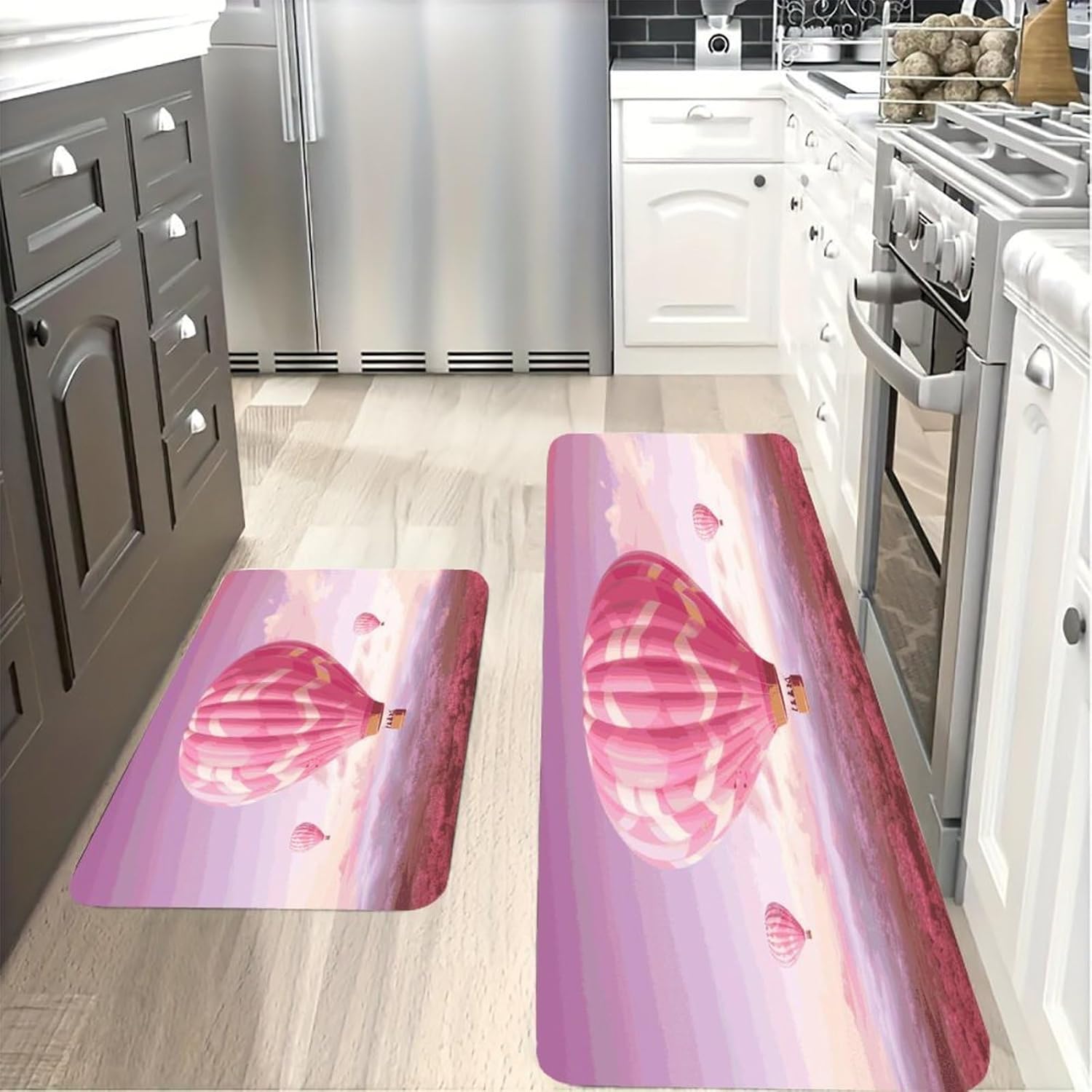 Step into instant comfort with our 2-piece Cushioned Anti Fatigue Mat set, designed to transform every standing moment into a relaxing experience. As a Comfort Desk Mat, it also eases the strain of long workdays, making it a versatile addition to any home.The Cushioned Anti-Fatigue Non-Skid Rug core offers plush support that hugs your feet, reducing the tension that comes with standing for hours. Unlike thin, flimsy alternatives, this Pink Hot Air Balloon Kitchen Rug is made with pill-resistant flannel that stays soft and neat through repeated use. It doubles as a Non Slip Comfort Standing Mat in your laundry room, taking the stress out of folding clothes or loading the dryer.Perfect for modern and rustic spaces alike, this Farmhouse Anti Fatigue Mat combines style with practicality. Use the Cushioned Kitchen Rug in your bathroom for a soft step out of the shower, or bring it outdoors for a comfortable spot to garden. Every detail is crafted to fit your busy lifestyle, from the easy-to-clean fabric to the multi-room functionality that makes this set a household staple.