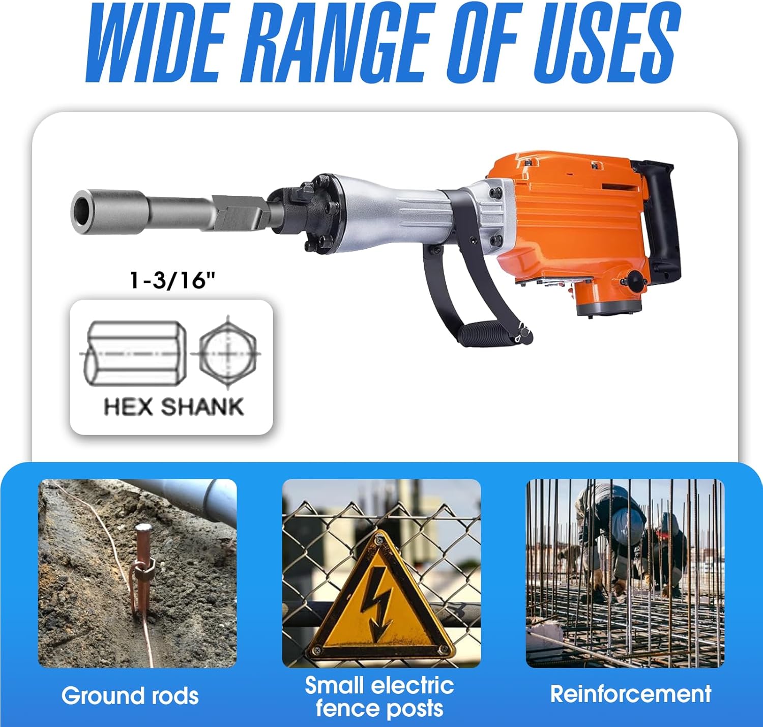 Professional Hex Shank Ground Rod Driver for Demolition Jackhammers Stop the exhausting and time-consuming process of driving ground rods by hand. Our Hex Shank Ground Rod Driver is the professional-grade attachment that turns your standard demolition electric jackhammer into a powerful, precise installation tool. Achieve perfect results for electrical grounding, fencing, and signage projects in a fraction of the time. Core Features & Benefits: ✔️ Eliminate Manual Sledgehammer Work Harness the raw power of your jack hammer. This ground rod driver attachment makes driving rods a quick, safe, and one-person operation. It transfers the intense impact force of your tool directly into the rod, saving your back and your valuable time. ✔️ Built with 40 Chrome Steel for Maximum Longevity We don’t cut corners on quality. Forged from tough 40 chrome steel, this driver is built to resist wear, deformation, and corrosion. It’s engineered to deliver durable performance job after job, standing up to the most demanding conditions. ✔️ Universal 1-3/16" Hex Shank Compatibility Get the right fit every time. Designed with a standard 1-3/16" Hex Shank, this driver is compatible with the vast majority of SDS-Hex Demolition Jackhammers on the market. It serves as a perfect replacement attachment for popular models from Vevor, Berserker, and other major brands. ✔️ A Must-Have for Your Hammer Drill Driving Kit Increase the versatility and value of your power tools. This ground rod bit is an essential addition to any professional or DIY hammer drill driving kit, enabling you to tackle a wider range of projects with a single, powerful machine. Product Specifications: Material: 40 Chrome Steel Shank Size: 1-3/16" Hex Total Length: 10-2/16" Compatibility: SDS-Hex Demolition Jackhammers Upgrade your toolkit today. Add this essential ground rod driver to your cart and experience a new level of efficiency and professionalism!