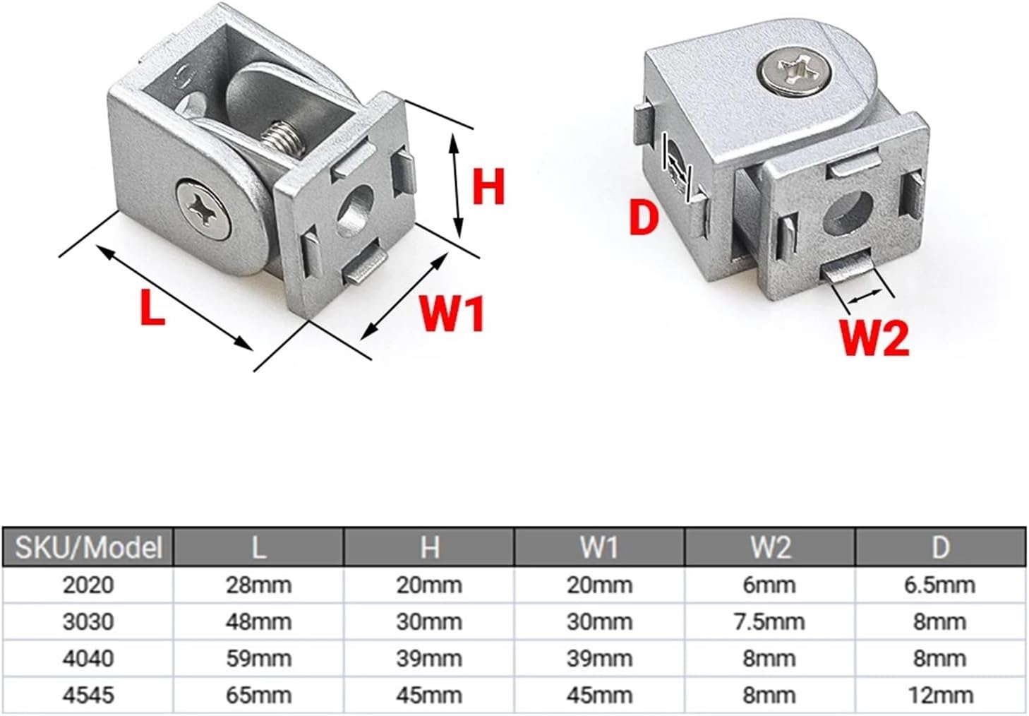 I-BeamsQuantity: 1 pieceMaterial: cast aluminumSize: 2020, 3030, 4040, 4545Color: SilverUsed for: connecting aluminum profiles at any angle, freely adjustable.Applicable to: 2020S, 3030S, 4040S, 4545SPackage Included: 1 x Zinc Alloy Flexible Hingeapplication: