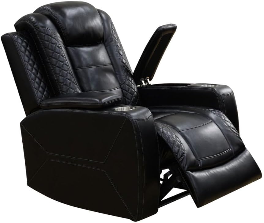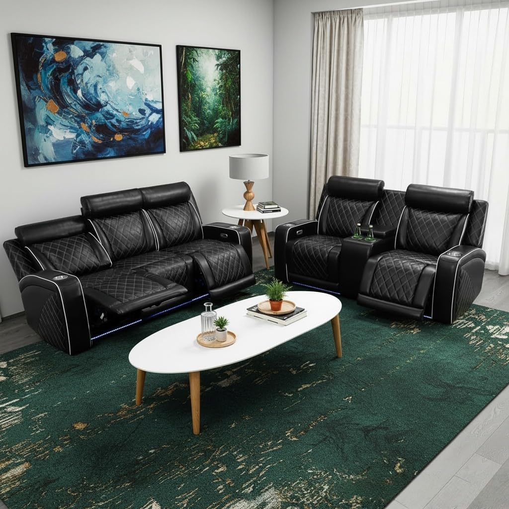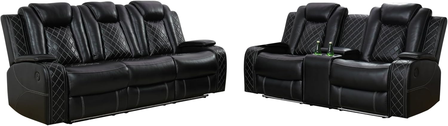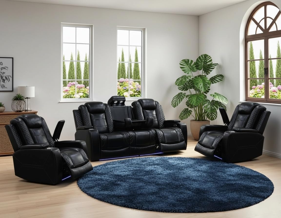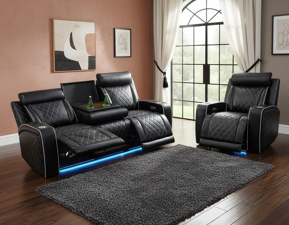 Introducing the Air Leather Power Recliner Sectional with LED Lights, Reader Lights, Storage Consoles, Cup Holders, USB Charging Port (Sectional Set) in elegant Black by Pon Living Furniture Inc. The high-quality leather used in crafting each piece, from the sectional leather couch to the recliner sectional couch, ensures both style and longevity. Unwind in comfort with the power reclining feature after a long day, while the LED accents on the sectional couch add a touch of modern sophistication to your living room. The black hue of the furniture set not only serves functional purposes but also enhances the aesthetic appeal of your home.