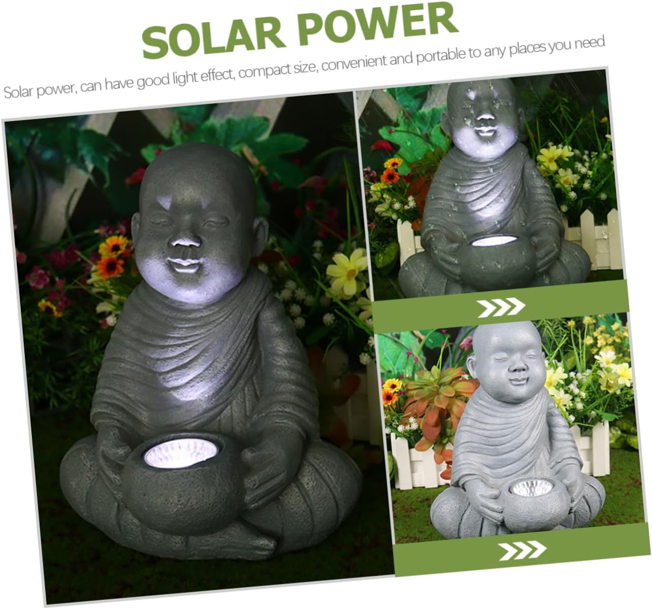 Package List 1 x Solar Light Ornament(lithium battery included) Features - Battery: 1.2v/600mAh.(The lithium battery included) resin solar light - Light color: white solar outdoor decor. - Solar panel: 2V/120mAh solar lamp. -Material:Resin outdoor solar light - Working time:About 6-10 hours garden solar light. -Color:Grey monk statue -Size:27.50X21.30X20.00cm/10.81X8.37X7.86in solar power lights - Using resin materials, excellent workmanship, not easy to deform or break, support longer term using lawn solar light. - Due to its monk appearance, it is lovely and creative, can bring you visual enjoyment outdoor lamp decor. - Can be placed in your outdoor garden, yard, pathway, lawn, light in weight, compact in size, fit your needs monk figurine. - This light adopts solar powered design, charge by the sunlight during the day and up at night yard solar lamp. - Not only can be used , but also can be a nice present option for your family or friends light decoration.Goods Descriptionoutdoor light Resin materials with detailed workmanship, and , can surely serve you much longer.monk statue This solar light is very useful and convenient.monk figurine Can also be a nice ornament due to its monk appearance.yard light decor It can be used as a light for outdoor, gardens, yard, lawn, and so on