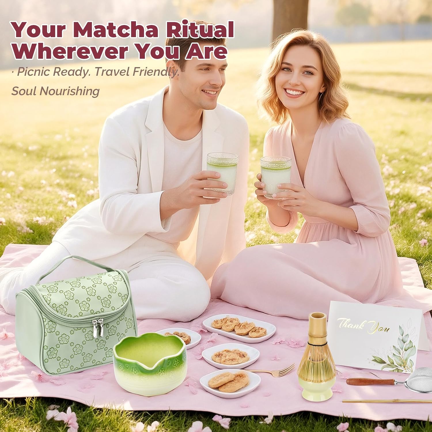 | Included Components | Bamboo Tea Scoop & Stainless-steel Tea Sifter, Bamboo Whisk & Ceramic Matcha Whisk Stand, Blank Thank-you Card with Envelope, Ceramic Matcha Bowl, Leather Storage Bag & Essential Accessories (velvet pouches, tea cloth & wipe) |