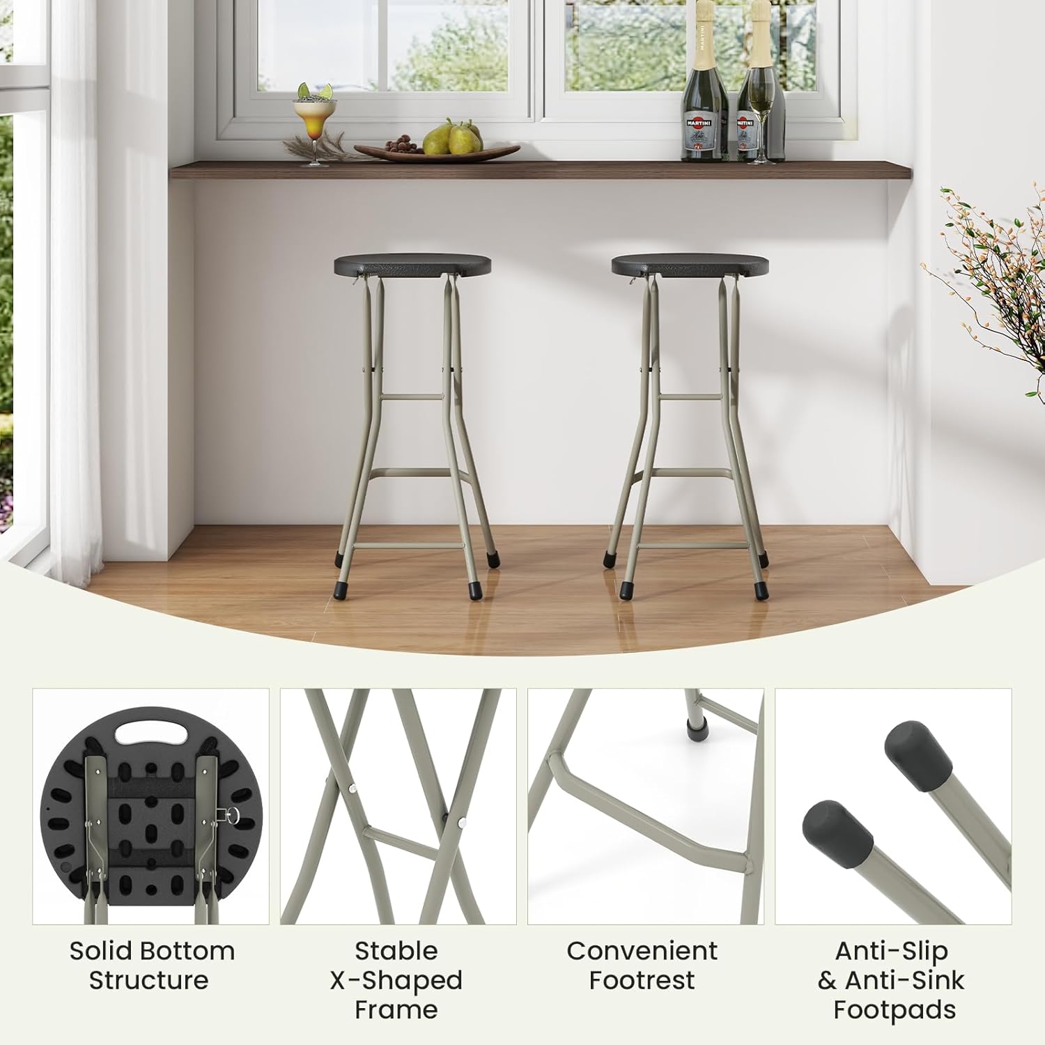 Description:Grab and Go Comfort for Any Occasion.Take a seat anywhere with these lightweight, bar-height folding stools designed for convenience and strength. Each stool features a rugged HDPE seat and powder-coated steel frame that supports up to 330 lbs, built to handle daily use indoors or outside. The 28-inch height is ideal for pairing with pub tables, outdoor bars, or kitchen counters. A stable X-frame structure and anti-slip feet provide reliable balance, while the integrated footrest keeps you comfortable longer. Foldable and compact with a built-in handle, the folding stools are easy to transport and tuck away in your car trunk, and great for small apartments, RVs, patios, and events like BBQs, camping, or fishing trips. Whether you're entertaining guests or relaxing by the firepit, these stools are always ready to unfold.Features:Features a wide seat and built-in footrest to enhance sitting comfortSturdy powder-coated steel frame supports up to 330 lbs with easeReinforced X-frame and anti-slip feet ensure excellent stability and safetyLightweight build with integrated carry handle allows for effortless transportFolding design offers easy storage and helps maximize limited spacePerfect for use in kitchens, campsites, picnics, fishing trips, and moreBuilt with weather-resistant HDPE seat for long-lasting outdoor performanceSmooth surface makes cleaning simple with just a damp clothArrives fully assembled for instant use and added convenienceSpecifications:Color: Black, SilverMaterial: Steel, HDPEExpanded Dimension: 14" x 12" x 28" (L x W x H)Folded Dimension: 14" x 2" x 39" (L x W x H)Net Weight: 5.5 lbsWeight Capacity: 330 lbsPackage Includes:1 x Folding Stool