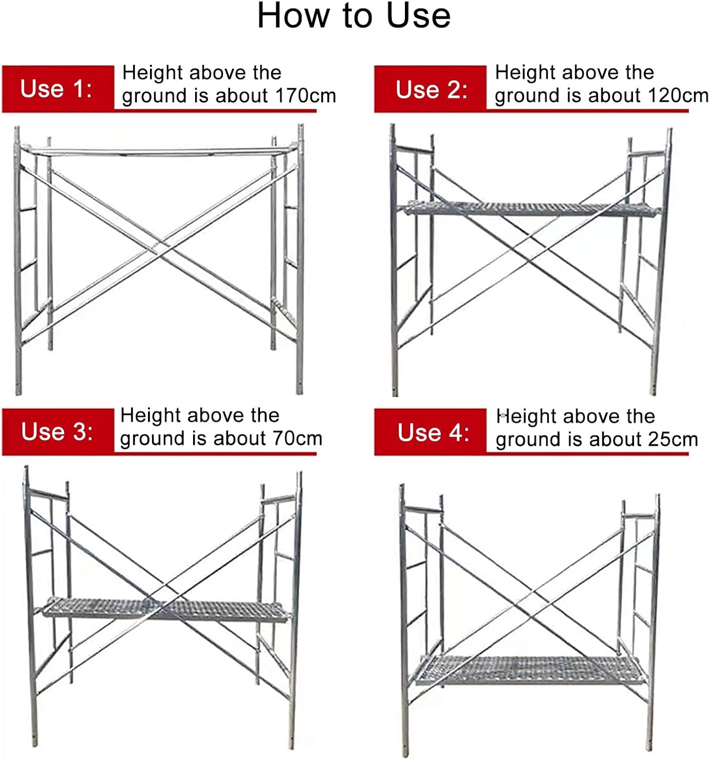 This portable work platform may be the right product you need. It is made of high-quality galvanized steel and can withstand a weight of approximately 500 pounds, making it very sturdy and durable and can meet your daily needs.The scaffolding systems and accessories are built to help make your work easier and safer. Safety is key when working in heights. Quality control, testing procedures, precision of the welding process, correct installation are key when assembling a scaffold structure to minimize liability and worker risk of injury.How to Use:Use 1: Height above the ground is about 170cmUse 2: Height above the ground is about 120cmUse 3: Height above the ground is about 70cmUse 4: Height above the ground is about 25cmSpecification:Product name: ScaffoldProduct Material: Galvanized SteelThickness: 2.0mm, 2.5mm, 2.7mmProduct Size: 180 x 95 x 170 cm/71 x 37 x 67 inProduct color: SilverAdjust height: 4 levelsWeight Capacity: 500lbsNotes:1. This product uses a welding process and may have welding marks. Please ensure that you do not mind before purchasing.2. Please allow the slight color difference caused by the shooting light and 1-3cm error due to manual measurement, and make sure you do not mind before you order.