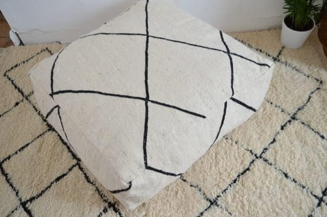 Hand-made beautiful Moroccan floor poufs made from Berber rugs and carpets. Take your pick from Beni Ourain, Boujaad, Boucherouite and many more traditional styles of Berber rugs. These poufs are expertly refashioned from old Beni Ourain rugs and carpets hand loomed by Berber woman from the Atlas Mountains in Morocco. Add warmth, style and elegance to your interior decor with the soft natural tones of the pure wool and sleek geometric lines add a trendy vibe. Create great seating combinations for your interior to entertain your guests add a selection of Berber pillows and cushions. Age New Material 100% Wool Colour Off White and Black Size 60 x 60 x 20 Carpet type Beni Ourain Origin Morocco. Beni Ourain Pouf supplied without insert or filling and unstuffed. A wide variety of fillings are available to purchase online or in store. We recommend fibre fill, down, coir or foam chips. Larger pieces of foam block can be cut to size to insert with pouf place a layer of fibre fill on top of the foam block for extra comfort. Polystrene balls can be used with an insert which is designed to fit inside the pouf. We love the eco friendly stuffing such as Sheeps Wool, coir or recycled textiles.