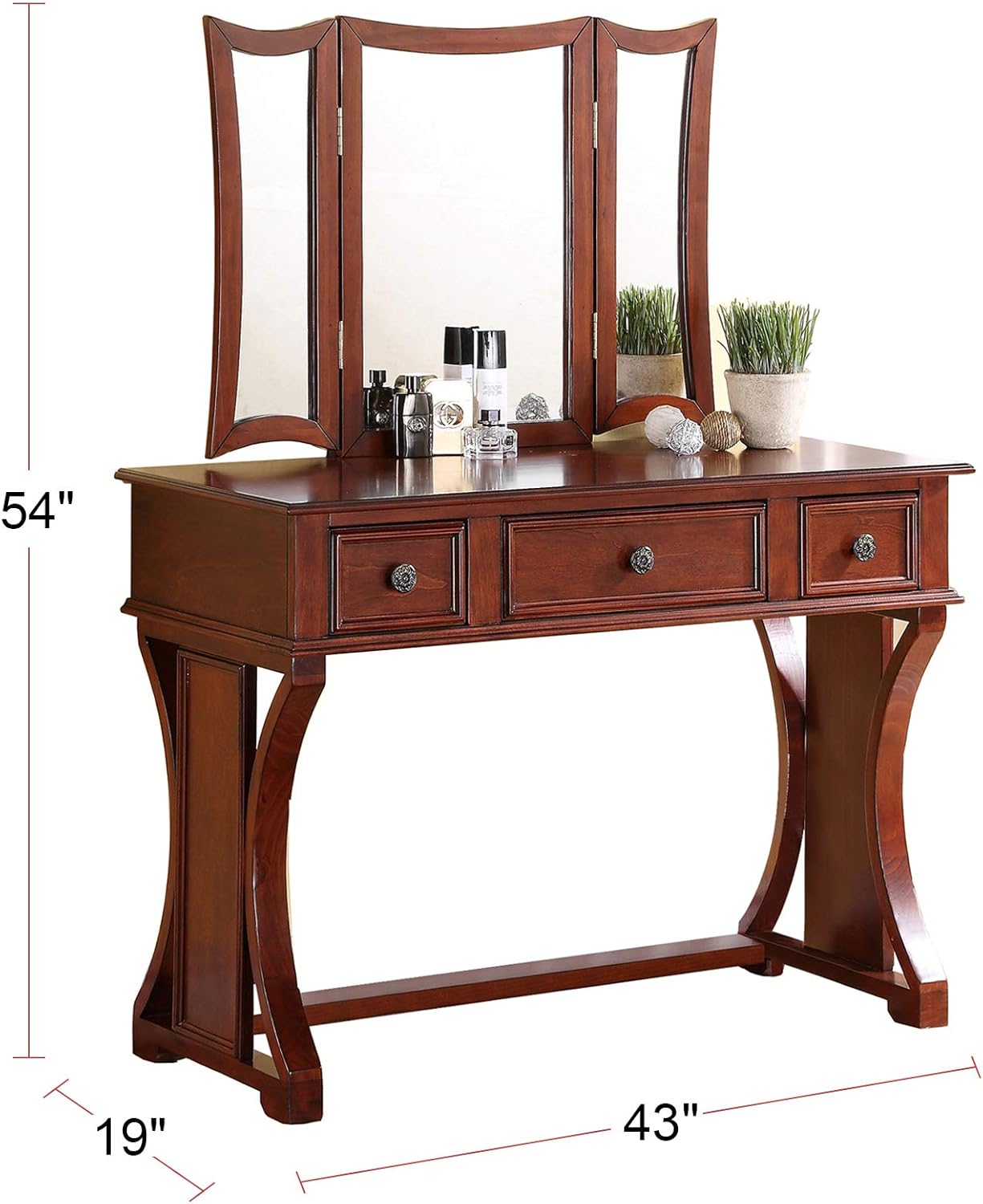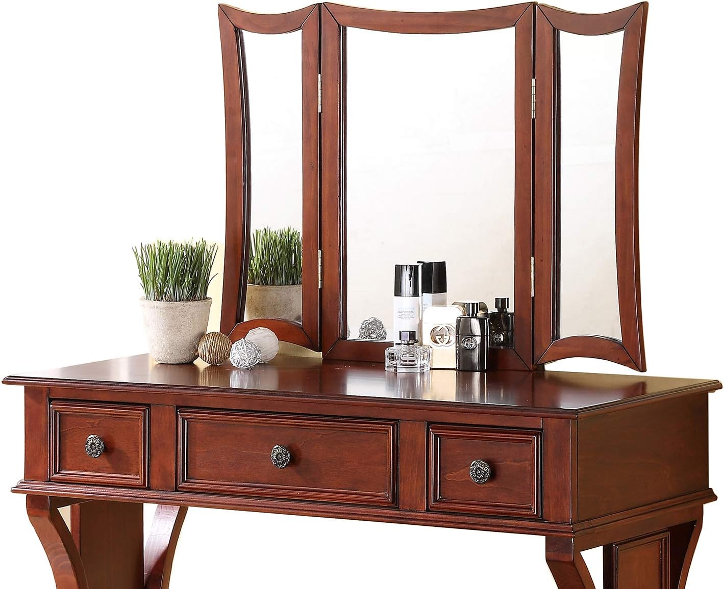 This beautifully designed vanity set features pine wood frame of rustic style. It includes a 3-panel mirror, table with functional drawers, and a cushioned stool. Each pieces is framed in feminine curves and lines making it the perfect addition to your bedroom. Available in black, apple green, cherry, and white.