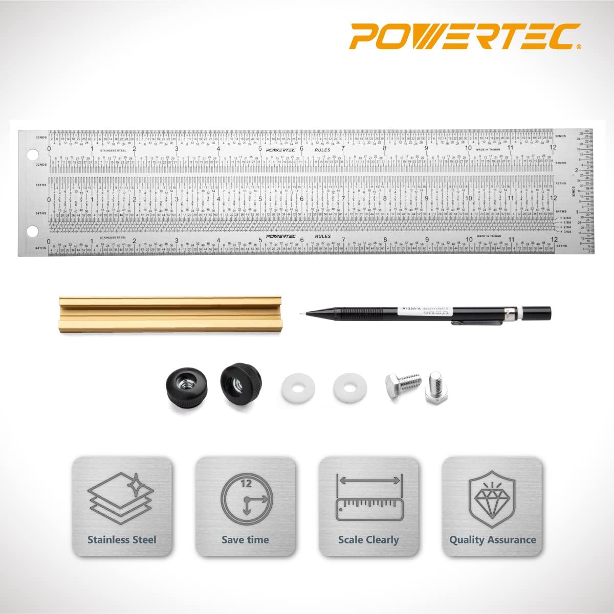Introducing the 6-Inch Precision Marking T Ruler by POWERTEC.These precision marking tools help locate your sharp pencil or scribe with high precision. Our T-Rule is perfect for woodworking and cabinet making, because it draws lines exactly where you want them to be. The stainless steel ruler has a clear, easy-to-read scale with permanent deep markings and graduations to ensure maximum readability for more efficient line drawing. The steel T-Rule is made of sturdy, highly durable and heavy duty stainless steel. A good measuring tool and easy to use, the stainless steel T-Rule possesses an impressive combination square that has deep etching scale for superior legibility and features marking holes and slots at every 1/16, 1/32 and 1/64” scale position to meet your needs. Versatile Commonly used by woodworkers, carpenters, designers, architects and engineers. Scribes lines horizontally, vertically, long, short, parallel and with right-angled to meet your needs. Package Contents: (1) 6” T-Ruler (1) T-Bar Included Hardware: (2) 1/4"-20 x 1/2" hex head screws (2) 1/4" plastic washers (2) 1/4"-20 round knobsStyle: 6 inches (approximately 15.25 cm) T-Rule Material: Stainless SteelT-Bar (T-track) Extruded Aluminum, Color: Anodized GoldPOWERTEC is a leading manufacturer of high quality woodworking tools and accessories, machines, and an assortment of OEM replacement parts. We are committed to exceeding expectations, while bringing the latest innovations, technology, and product development to the industry.Introducing the 12-Inch Precision Marking T Ruler with Pencil Set by POWERTEC.These precision marking tools help locate your sharp pencil or scribe with high precision. Our T-Rule is perfect for woodworking and cabinet making, because it draws lines exactly where you want them to be. The stainless steel ruler has a clear, easy-to-read scale with permanent deep markings and graduations to ensure maximum readability for more efficient line drawing. Set Includes 0.5 mm mechanical pencil to produce crisp fine lines for drawing and drafting. The steel T-Rule is made of sturdy, highly durable and heavy duty stainless steel. A good measuring tool and easy to use, the stainless steel T-Rule possesses an impressive combination square that has deep etching scale for superior legibility and features marking holes and slots at every 1/16, 1/32 and 1/64” scale position to meet your needs. Versatile Commonly used by woodworkers, carpenters, designers, architects and engineers. Scribes lines horizontally, vertically, long, short, parallel and with right-angled to meet your needs. Package Contents: (1) 12” T-Ruler (1) T-Bar (1) 0.5 mm mechanical pencil Included Hardware: (2) 1/4"-20 x 1/2" hex head screws (2) 1/4" plastic washers (2) 1/4"-20 round knobsStyle:12 inches (approximately 30.5 cm) T-Rule Material: Stainless SteelT-Bar (T-track) Extruded Aluminum, Color: Anodized GoldPOWERTEC is a leading manufacturer of high quality woodworking tools and accessories, machines, and an assortment of OEM replacement parts. We are committed to exceeding expectations, while bringing the latest innovations, technology, and product development to the industry.