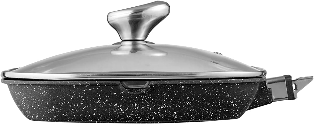 Professional high quality product, dimensionally stable and a long lasting life. Structure of cast aluminium with a non-stick "stone appearance" coating to preserve all the flavours of your food. This grill pan allows you to cook your meat without adding fat. Dimensions 24 x 24 cm.