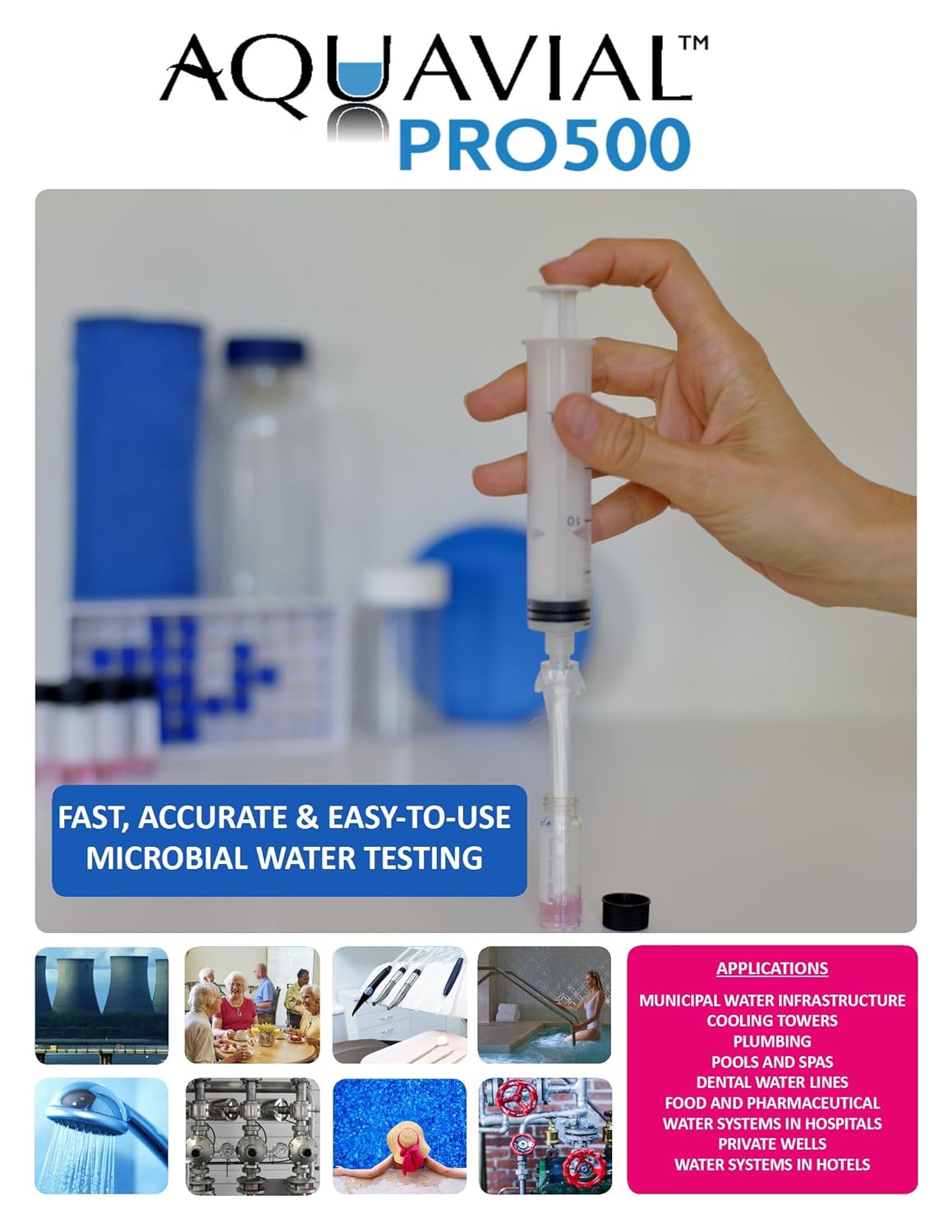 AquaVial PRO is the ideal water quality screening tool for water treatment professionals.AquaVial PRO was designed for monitoring microbial levels and biofilm formation for drinking water applications. It is an economic and efficacious warning system for Legionella control, and efficacy confirmation of water disinfection systems and other high risk water sources, such as medical and dental water systems. AquaVial PRO detects total microbial (bacteria and fungi) and biofilm levels above 200 CFU/ml. Why Should You Use AquaVial PRO500? Microorganisms have a huge advantage over us: i.e. speed. Most microorganisms replicate several times a day, and evolve very fast to survive the various treatments as we develop them. The best example is the increase of Legionella outbreaks at a rate higher than our ability to upgrade our water treatment technologies. And while we are concentrating our efforts on developing Legionella-specific testing and treatments, we are at risk of forgetting that biocides used in water treatment should not be specific but cover a broad spectrum. How is AquaVial PRO different? AquaVial PRO is a non-specific detection method for microorganisms, that detects the presence of a viable cell. It does not depend on enzyme levels, nutrients present in the environment, or metabolic by-products, which makes it a more reliable test method than ATP or chromogenic dye- based tests. Compared with other tests on the market, our test has a simpler and easy to use testing method.