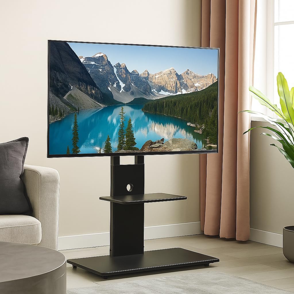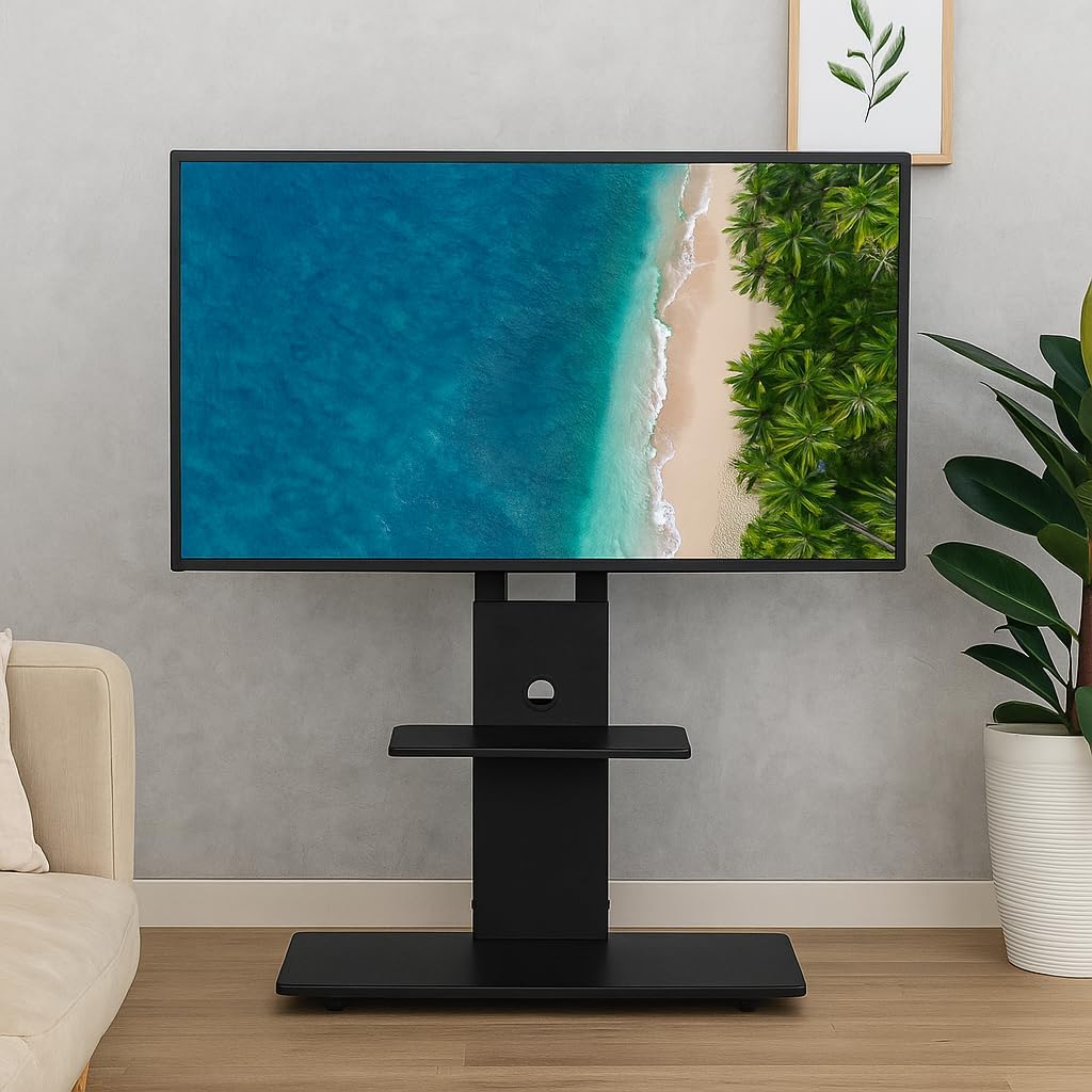 The Panamera TV Stand is designed with heavy gauge steel to hold TVs from 40" to 80" in size. A large base sized 31 1/2" x 15 3/4" makes the unit very stable. Middle shelve, size 19" x 9 1/2", can be adjusted. The clearance between the two shelves is 13" to 14.5". Center upright is designed with wire management to hide the wires for your AV accessories. Color: Black